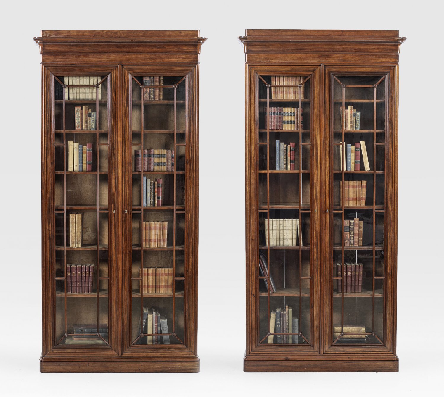 Paar große viktorianische Bibliotheksschränke Mahagoni furniert. Gerader hochrechteckiger Korpus auf schmalem profiliertem Zargensockel mit gerundeten Ecken. In der gegliederten Front zwei gestreckte sprossenverglaste Vitrinentüren. Korrespondierendes leicht gekehltes und gestuft ansteigendes Profilgesims. Variable Einlegeböden. H. 250 cm. 125 cm x 45 cm.