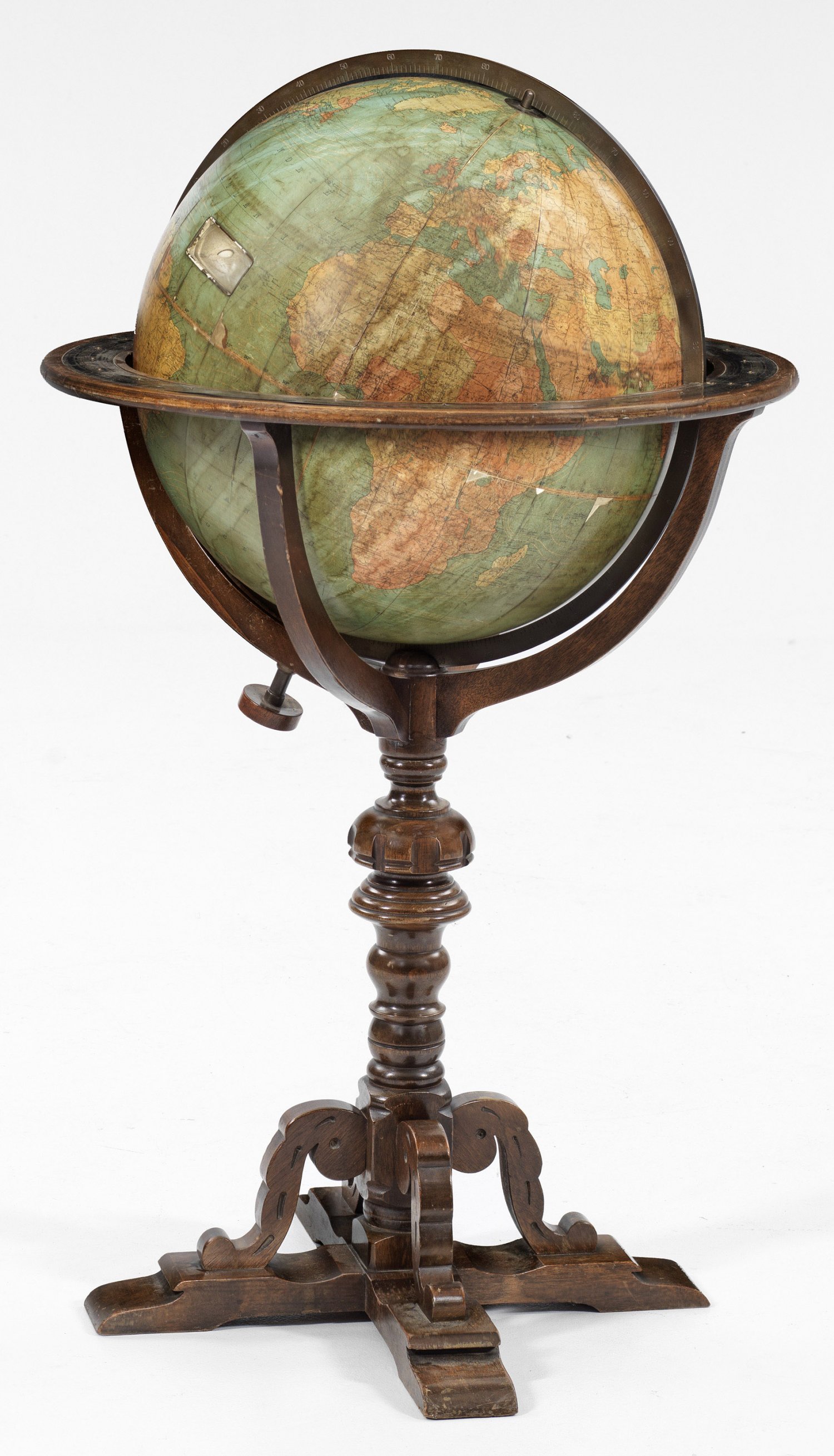 Großer Bibliotheksglobus Nussbaum und Messing. Gestell über kreuzförmigem Fuß mit hohem Balusterschaft. Drehbare, aus 12 lithographierten und kolorierten Segmenten bestehende 18-Inch-Erdkugel. U. a. mit eingezeichneten Eisenbahnstrecken und Meeresströmungen. Achse und Vollkreismeridianring aus Messing mit gravierter Messskala. Äquatorring mit eingelassenem Messingreif und reliefierter Skala der Monatseinteilungen und Himmelsrichtungen. Gegenüberliegend mit je zwei eingefassten, rechteckigen Lupen. In Kartusche bez.; Herstellerzeichen. Altersgemäße Gebrauchsspuren, minim. besch.; H. 105 cm.