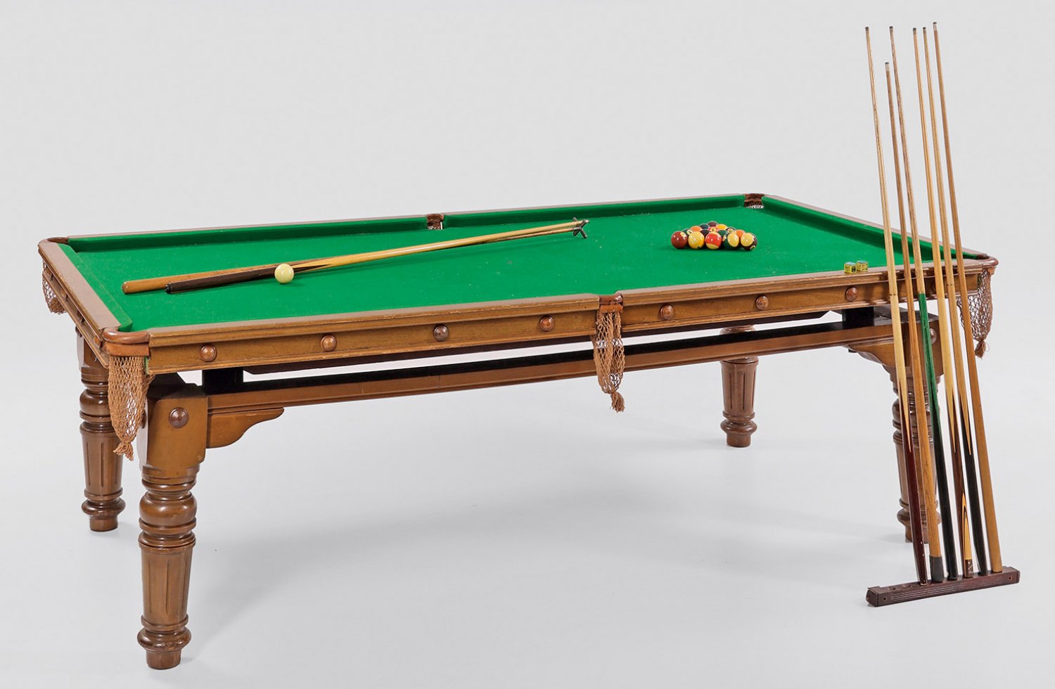 Billard-Tisch von E. J. Riley Nussbaum. Gerade Zarge auf kräftigen, mehrfach gegliederten und teilw. kannelierten Balusterbeinen als Träger für höhenverstellbare Deckplatte mit grüner Filzbespannung. An der Zarge bez. "E.J. RILEY Ltd A8994 ACCRINGTON". Dazu drei Kugelsätze für Poolbillard und Snooker, Diverse Queues, Aufsatzdreieck, Billard-Bürste und Anzeigetafel. Fünf Abdeckplatten. H. 84 cm. 255 cm x 135 cm.