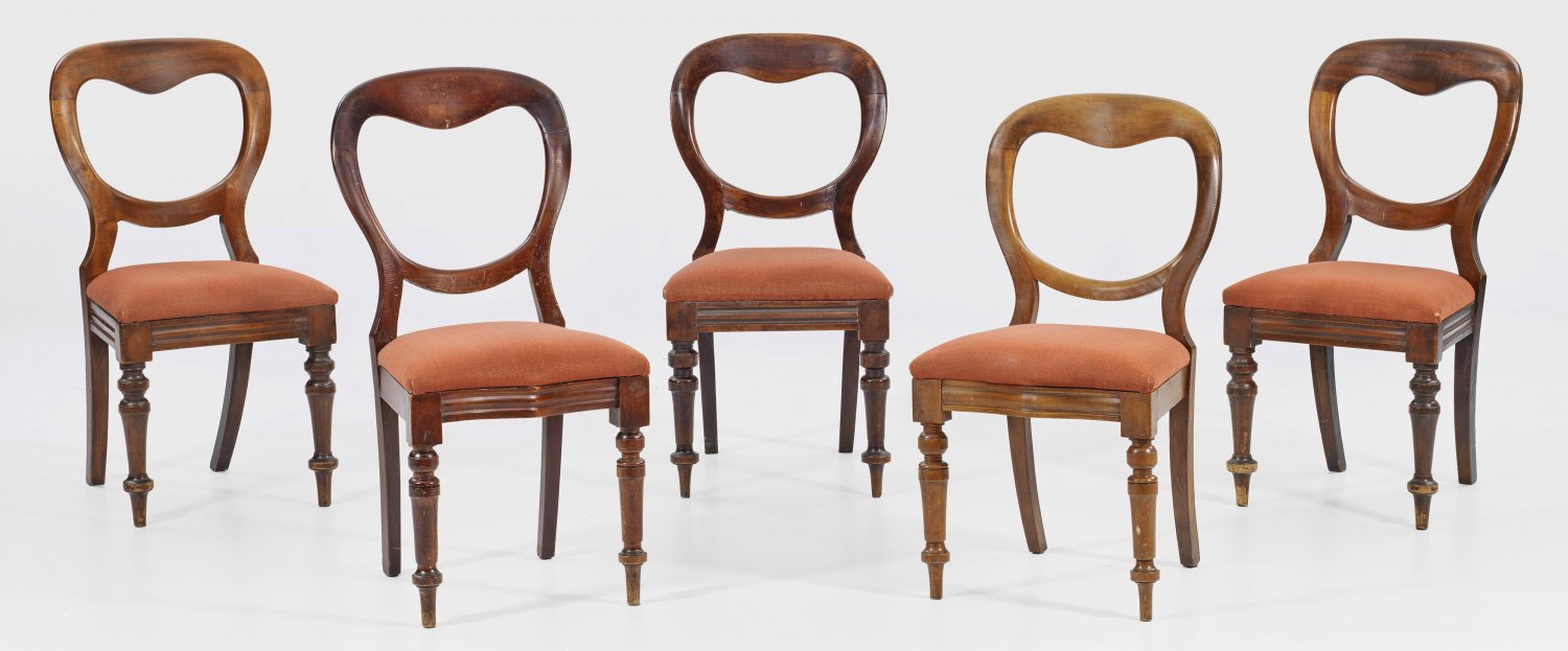 Satz von fünf Stühlen Mahagoni. Bombierte Zarge auf mehrfach gegliederten Balusterbeinen sowie offen gestaltete ballonförmige Rückenlehne. Sitzfläche gepolstert und bezogen. Sitz-H. 45 cm.