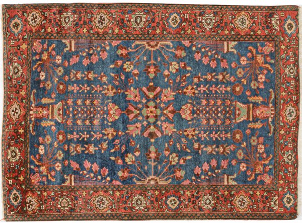 Alte Lilian-Brücke Persien. Um 1940. Wolle auf Baumwolle. Im blauen Innenfeld flächendeckende Musterung aus großzügig angelegten Blütendolden und Rispen in Rosétönen. Umlaufend breite rotgrundige Palmettenbordüre flankiert von schmalen Nebenbordüren. Verkürzt. 144 cm x 103 cm.