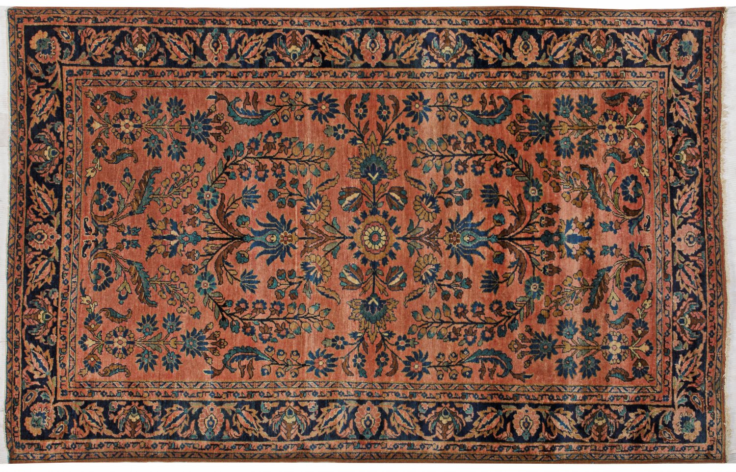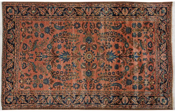 Alte Sarough-Brücke Persien. Um 1920. Wolle auf Baumwolle. Naturfarben. Im rotbraunen Innenfeld flächendeckende Musterung aus großzügig angelegten Blattranken und Blütenrispen. Umlaufend dunkelblaue Bordüre aus Palmetten und Blattwerk. 135 cm x 213 cm.