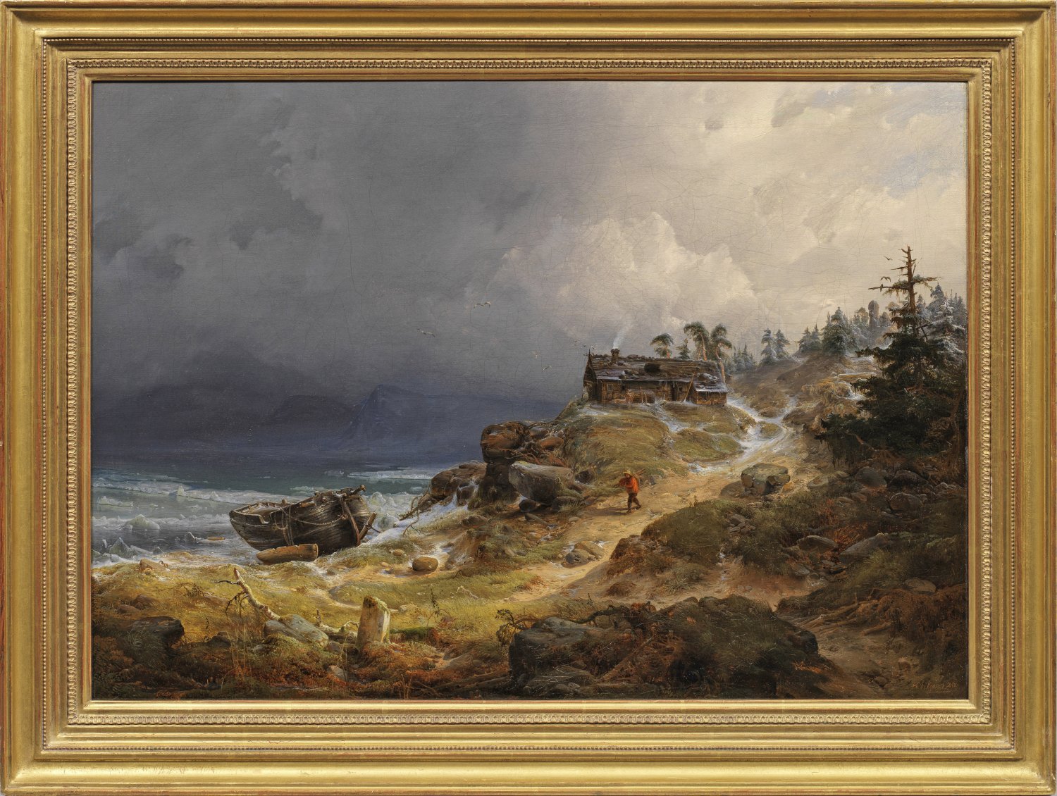 Blick auf eine einsame, skandinavische (bzw. norwegische) Landschaft mit felsiger Küste, pittoresker Fischerhütte und vereistem Meer, belebt durch einen Fischer in roter Jacke auf dem Weg zu seinem Boot. Frühes, in der Wiedergabe der Landschaft und atmosphärischen Stimmung grandioses Hauptwerk des Malers, der 1833-1844 die Akademie bei Johann Wilhelm Schirmer besuchte und mehrere Jahre in dessen Meisterklasse war. Er malte mit Vorliebe romantisierende Winterlandschaften, die ab 1838 auf vielen Ausstellungen große Anerkennung fanden. Besonders gerühmt wurde deren sichere Durchzeichnung, Naturwahrheit und klares, harmonisches Kolorit. Öl/Lwd.; R. u. sign. u. dat. (18)40. Verso auf altem, originalem Etikett vom Künstler betitelt und bez. "Composition ist zum Verkauf für den Prais von 18 Fridor (Friedrich d’or) C. Hilgers". 47,5 cm x 68 cm. Rahmen.