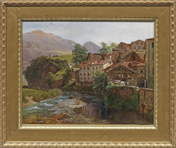Spätromantische Landschaft mit Blick auf das pittoreske, kleine Dorf Paularo in Karnien (bzw. in den Karnischen Alpen) in der Region Friaul-Julisch Venetien (Provinz Udine), gelegen in einem Tal namens Valle d'Incarojo oder Val Chiarsň bzw. Valle di Paularo. Schirmer, der führende Landschaftsmaler der Düsseldorfer Schule vor Andreas und Oswald Achenbach, unternahm 1839/40 eine lange Italien-Reise. Öl/Lwd., oberhalb auf festem Karton montiert. Verso auf der Lwd. in Bleistift bez. "Paularo d'Incaroja (Friaul) / östl. v. Pontebba". 31,8 cm x 40,7 cm. Rahmen.