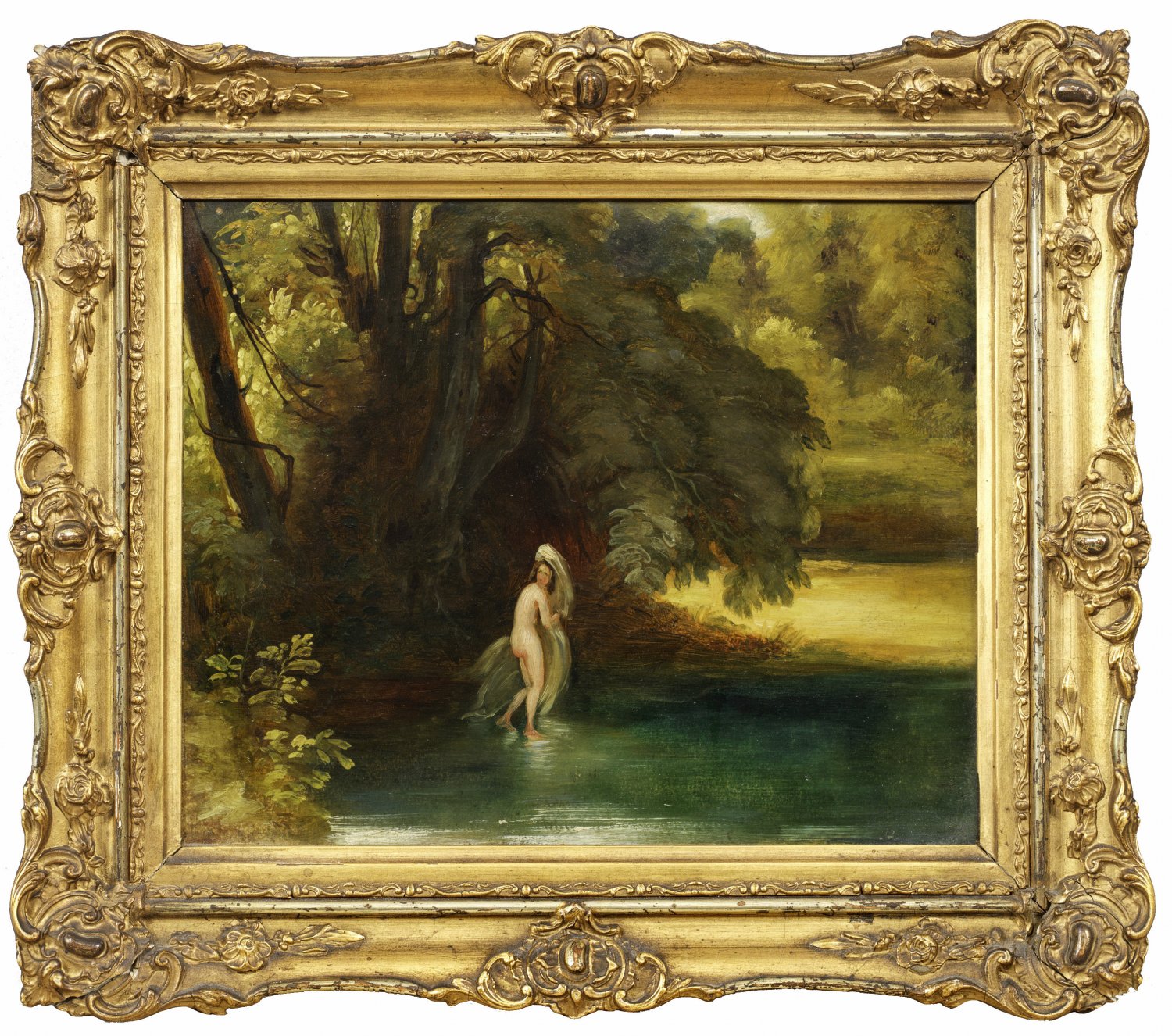 Wohl um 1830-1835 oder noch während seiner ausgedehnten Italien-Reise von September 1828 bis November 1829 entstandenes, kleinformatiges Werk Blechens. Dieses spiegelt sowohl die unmittelbaren Eindrücke seiner Reise als auch das direkte Erlebnis der Werke William Turners wider, die ihn zum koloristisch verzahnten Bildaufbau aus warmen und kühlen Tönen anregten. Turner selbst war zur selben Zeit 1828/29 in Rom, wo er auch drei dort 1828 entstandene, ungeheures Aufsehen erregende Bilder ausstellte, darunter "Vision der Medea", die Blechens Farb- und Lichtgestaltung beeinflussten. Nach Blechens Rückkehr nach Berlin wurde der Maler 1831 auf Empfehlung Karl Friedrich Schinkels zum Professor für Landschaftsmalerei an der Berliner Akademie berufen, 1835 ernannte man ihn zum ordentlichen Mitglied. Im Zusammenhang und Vergleich mit dem vorliegenden Bild muss Blechens berühmtes Gemälde "Park von Terni mit badenden Mädchen" von 1835 in der Berliner Nationalgalerie gesehen werden, dessen aufreizende Szene zu einer seiner erfolgreichsten Kompositionen wurde. Auch bei diesem stellte Blechen nicht mythologisch verklärte weibliche Akte dar, sondern zwei Italienerinnen seiner Zeit, die im Begriff sind, ins Wasser zu steigen. Aufgrund des großen Interesses schuf Blechen mehrere Repliken und einige kleinere Versionen. Eine der kleinformatigen Fassungen kaufte Bettina von Arnim 1838 und war entzückt von der "schönsten Farbvollendung" der "bewunderungswürdigen Landschaft". Öl/Papier, alt auf Lwd.kaschiert; Verso alt betitelt "Badende Nymphe". 21,8 cm x 27,3 cm. Wohl Original-Rahmen. Rahmen geringfügig bestoßen.