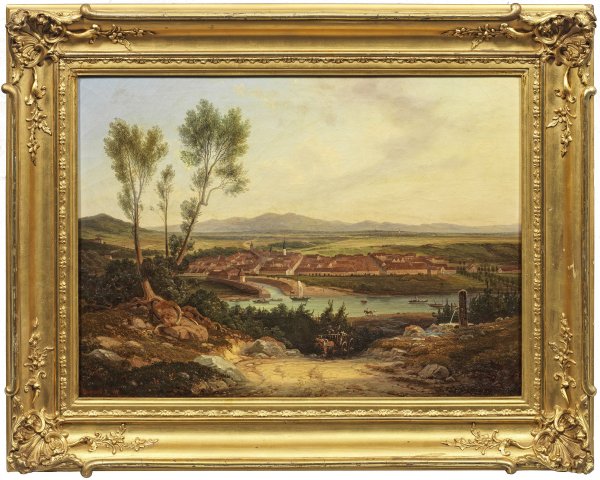 Blick von einem erhöhten Standpunkt über den Rhein mit bayerischer Königsjacht Ludwig I. auf die spätere Stadt. Biedermeierliche, fein gemalte, detailreiche Vedute, welche die Situation vor der Ansiedlung der BASF im Jahr 1865 schildert und hierdurch auch von historischer Bedeutung ist: 1843 hatte der bayerische Staat eine florierende Handelsniederlassung am Rhein erworben und zu Ehren König Ludwig I. von Bayern in Ludwigshafen umbenannt. Öl/Lwd.; L. u. sign. u. dat. (18)47. 44 cm x 61 cm. Original-Rahmen.