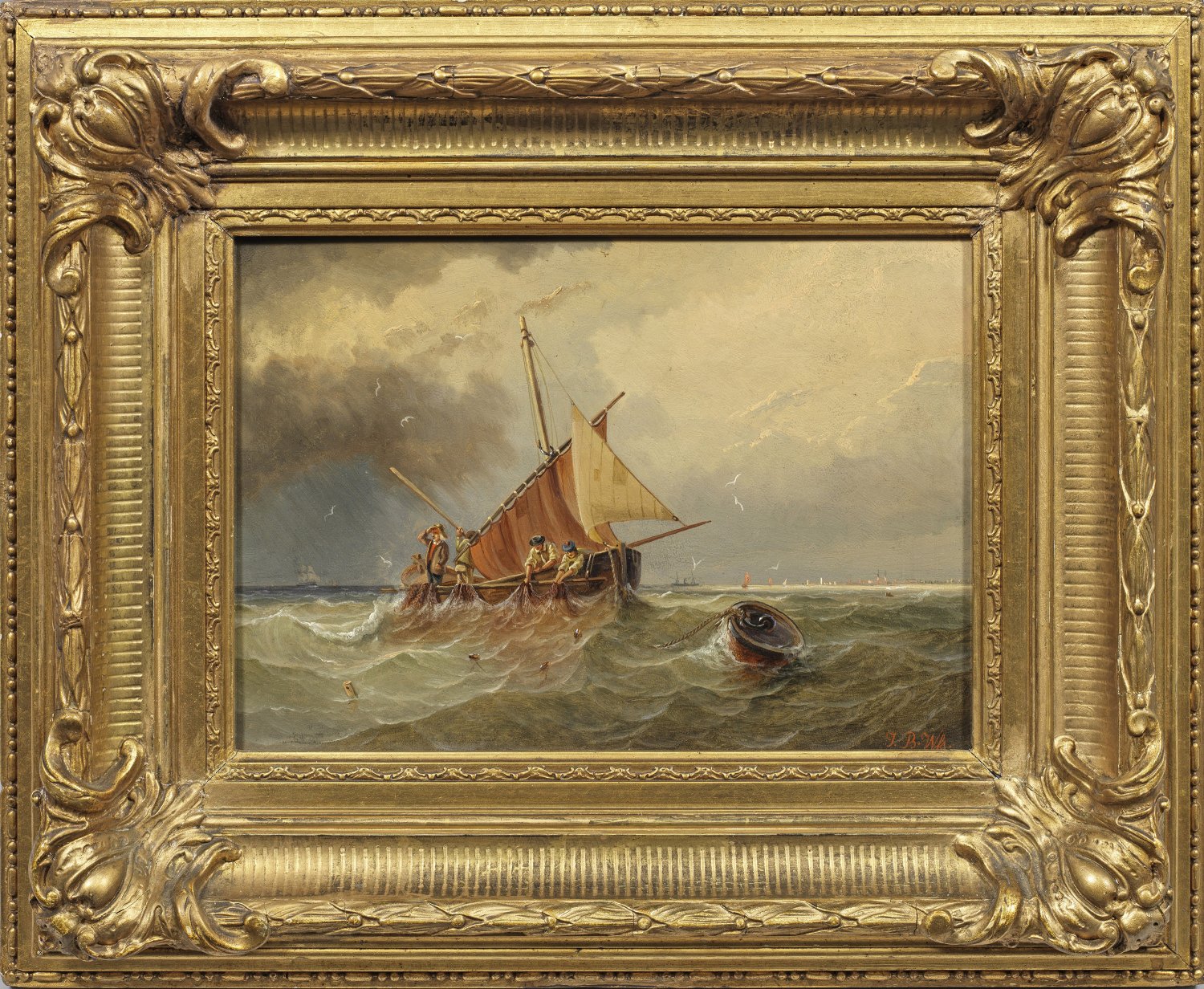 Atmosphärisch gestimmte Darstellung eines kleinen Fischerbootes mit seiner Besatzung beim Einholen des Netzes in der kabbeligen Nordsee. Weiss bereiste u. a. die Küsten Hollands, Skandinaviens und Englands. Öl/Malkarton. R. u. sign.; Verso wohl eigenhändig bez. u. betitelt mit Ortsangabe München; Malwarenstempel von A. Lenck, München. 24,5 cm x 34,5 cm. Original-Rahmen.