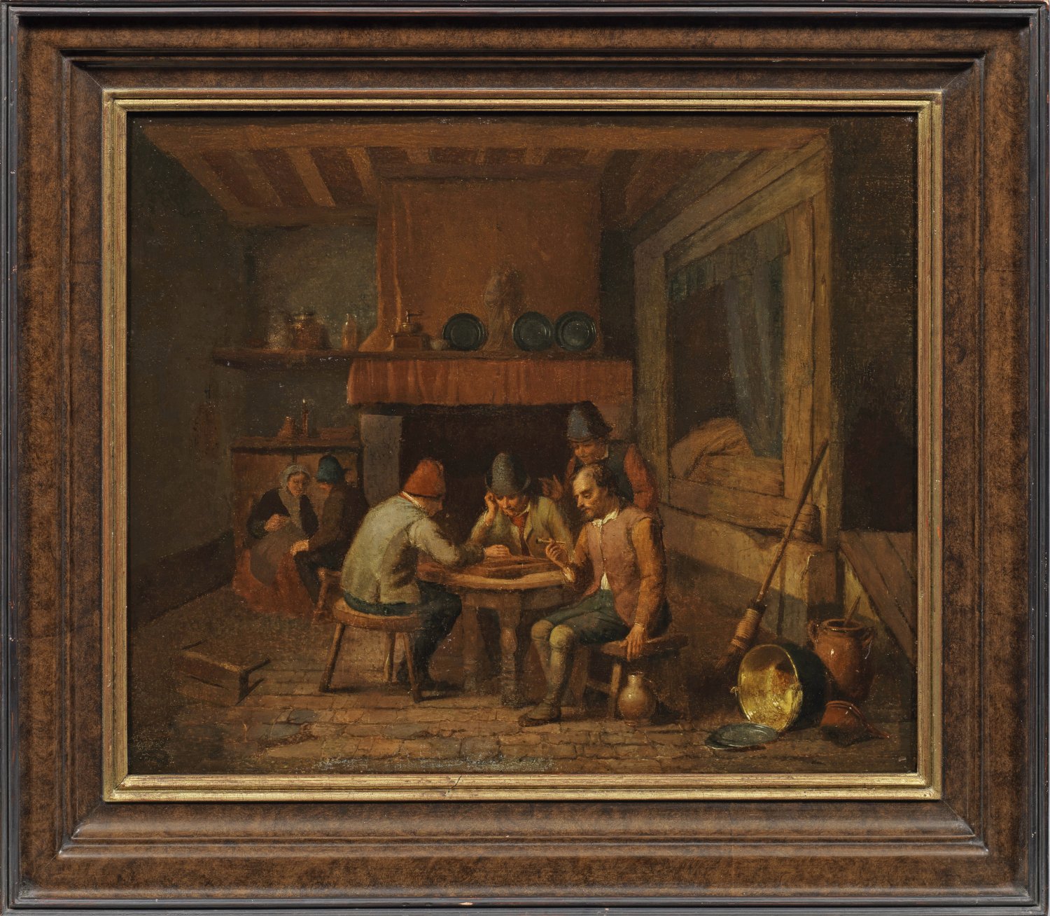 In tonigem Kolorit gemalte Wirtshausszene mit Männern bei einem Brettspiel. Der von Joseph De Cauwer und Ferdinand de Braekeleer ausgebildete Künstler schilderte vornehmlich ländliche Genreszenen und Jahrmarktmotive des 17. Jhs. in der Tradition von David Teniers und Adriaen van Ostade. Öl/Mahaghonitafel. Verso sign., betitelt u. dat. "Mars 1869". Verso Klebezettel eines Albert de la Croix (wohl 1839 - 1887, lebte in Berlin) mit Angaben zum Künstler. 41,5 cm x 49,5 cm. Rahmen.
