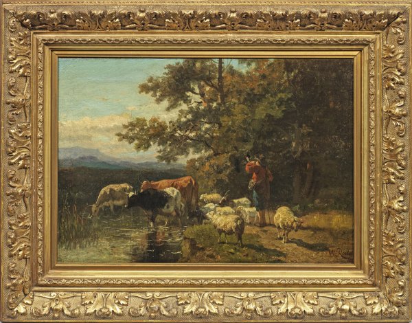 Hirte mit Schafen und Kühen an der Tränke