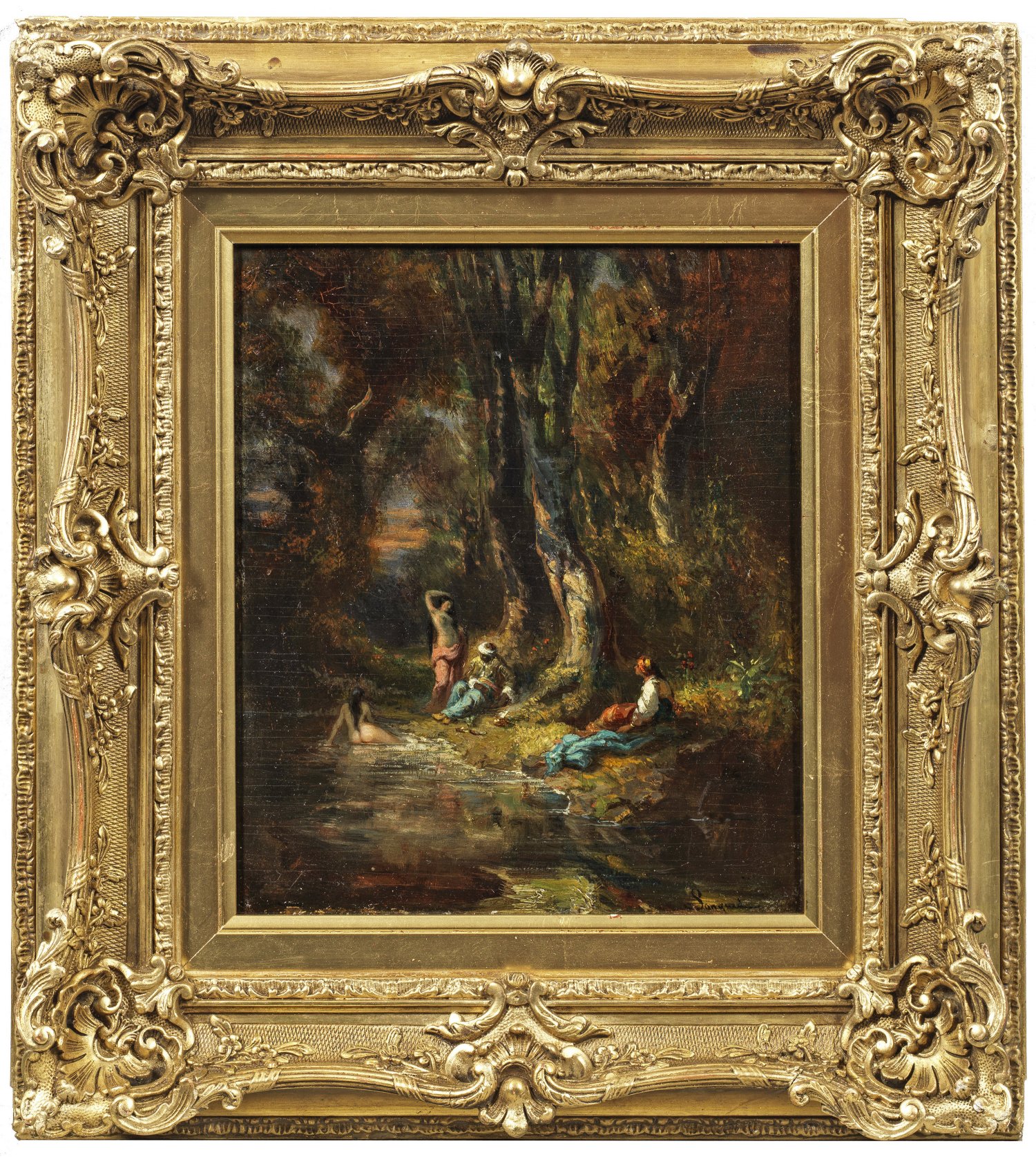 Mehrfigurige Szene auf einer Waldlichtung. Longuet verbindet in diesem kleinformatigen, für sein Oeuvre repräsentativen Gemälde ein Landschaftsmotiv aus dem Wald von Fontainebleau mit einem orientalischen Thema und Aktdarstellungen in Gestalt der Badenden. Geschildert werden ein im Wasser sitzender Halbakt als Rückenansicht, ein stehender Halbakt und zwei weitere, am Ufer sitzende Figuren in orientalischer Kleidung bzw. mit Turban. Longuet, der sein Atelier im Pariser Künstlerviertel Montmartre hatte, wurde von Narcisso Virgilio Díaz de la Peńa und der Schule von Barbizon beeinflusst. 1831-1850 stellte er auf dem Salon in Paris aus. Werke Longuets befinden sich u. a. im Musée Magnin in Dijon und dem Musée Farbre in Montpellier. Öl/Holztafel. R. u. sign.; 29 cm x 23 cm. Rahmen.