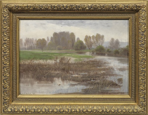 Pastelltonig gemalte, frühe Landschaftsimpression. Der an den Akademien in München und Wien ausgebildete Radimský ging 1889 nach Frankreich. Um 1891 zog er über Barbizon nach Giverny, wo er sich der Künstlergruppe um Monet und Pissarro anschloss, die ihn nachhaltig beeinflussten. In der Nähe von Giverny und dem Wohnsitz Monets erwarb Radimský eine alte Mühle und richtete sich dort ein Atelier ein. Zu Hauptmotiven seiner Bilder wurden Flusslandschaften, Gärten, Wiesen und Seerosen, bei denen er die Wirkungen des Lichts in Verbindung mit Wasserflächen schilderte. Ab 1892 stellte er regelmäßig im Pariser Salon aus, es folgten erfolgreiche Ausstellungen in Prag, Wien, Berlin, Düsseldorf und Leipzig, 1900 seine Teilnahme an der Weltausstellung. Öl/Lwd.; L. u. sign. u. dat. (18)92. Verso Malwarenstempel von A. Bouché, Rue de Rennes 133, Paris. 32,5 cm x 46 cm. Rahmen.