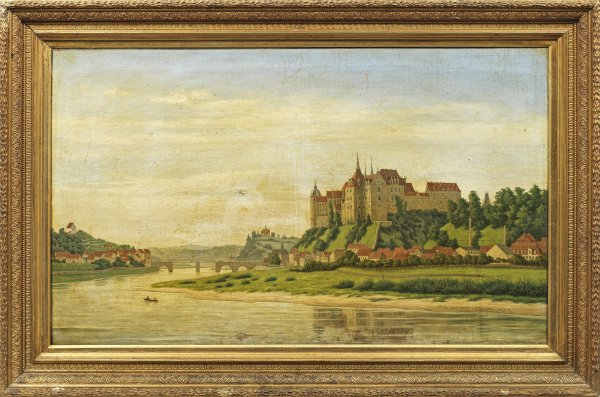 Blick von der anderen Elbseite auf die Stadt mit der prachtvollen, berühmten Albrechtsburg, die wegen ihres spätgotischen Architekturensembles als erster Schlossbau Deutschlands gilt und in der seit 1710 auch die Porzellanmanufaktur untergebracht ist; auf der linken Bildseite die Altstadtbrücke. Seltene, spätromantische Vedute des Malers, der sonst hauptsächlich in Norddeutschland tätig war. Jessen studierte 1855-1865 an der Kopenhagener Akademie bei Vilhelm Marstrand, 1867-1869 unternahm er mit einem stattlichen preußischen Stipendium zwei Reisen nach Paris und Italien. Er wurde danach ein Meister in der detailgetreuen Darstellung des Lebens in Nordfriesland, so dass seine Werke auch von kulturhistorischer Bedeutung sind. Der künstlerische Durchbruch gelang ihm 1876, als der Schleswig-Holsteinische Kunstverein das Bild "Friesisches Thinggericht" erwarb, das sich heute in der Kunsthalle Kiel befindet; 1878 entstand das bis heute berühmteste Bild "Sonntagmorgen vor der Kirche", das in verschiedenen Fassungen existiert. Zahlreiche Museen besitzen Werke Jessens, u. a. die Kunsthalle Kiel, die Kunsthalle Hamburg, das Altonaer Museum in Hamburg, der Museumsberg Flensburg und das Germanische Nationalmuseum in Nürnberg. Öl/Lwd.; R. u. sign. und dat. 1879 mit Ortsangabe Meissen. Ger. Läsuren, reinigungsbedürftig. 60 cm x 100 cm. Original-Rahmen.