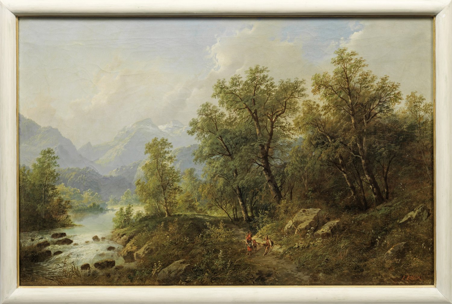 Alpenlandschaft mit Figuren in einem bewaldeten Flusstal