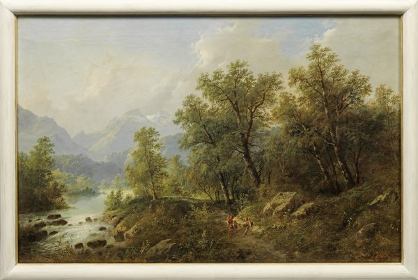 Spätromantische, sommerliche Stimmungslandschaft. Boehm lenkt den Blick des Betrachters durch eine subtile Licht- und Farbperspektive tiefenräumlich vom Vordergrund mit Laubbäumen in Braun- und Grüntönen auf die Berge und den duftig bewölkten Himmel in zarten Blaunuancen. Der Künstler war auf idealisierende Alpenlandschaften mit beschaulichen Ausschnitten spezialisiert, die sich durch akribische Behandlung der Naturdetails, atmosphärischen Erscheinungen und des Lichts auszeichnen. Seine Hauptmotive waren Gebirgsbäche, Flusstäler und Seen sowie monumental aufragende Bergmassive und deren Schönheit und Erhabenheit. Hierfür bereiste er, wie seine erhaltenen Gemälde zeigen, weite Teile des Alpenraums von den Ostalpen in der Steiermark über Oberbayern und Tirol bis in die Schweiz. Öl/Lwd.; R. u. sign.; 68,5 cm x 105 cm. Rahmen.