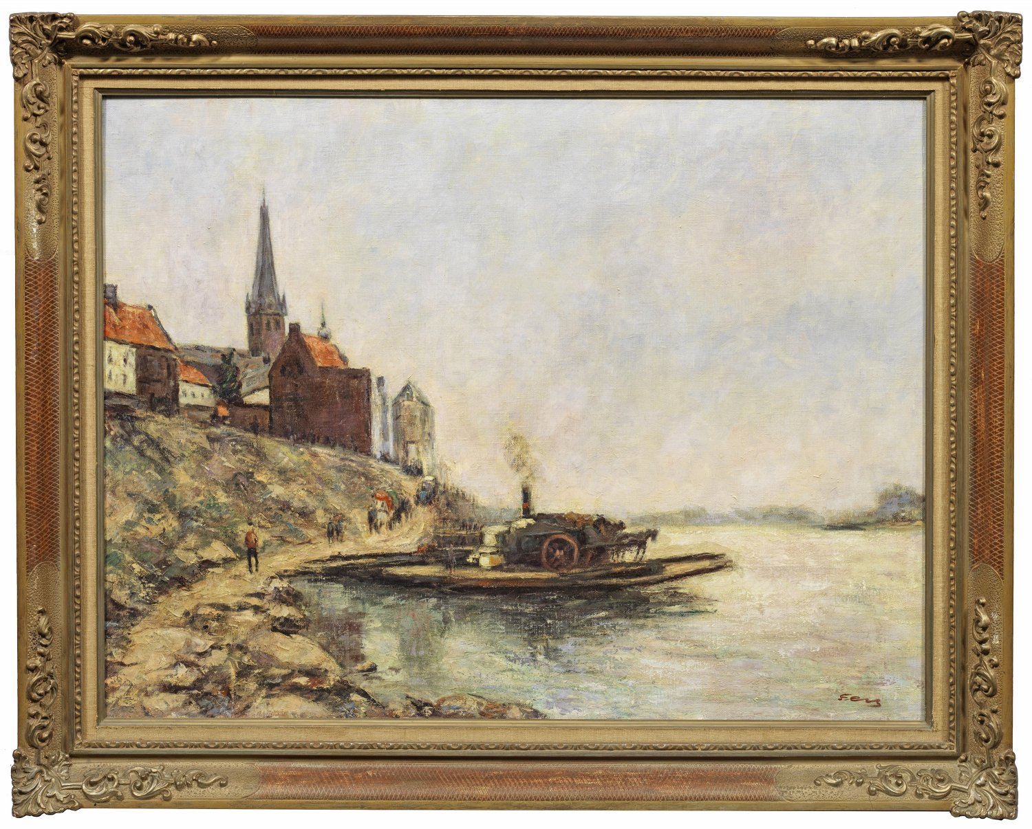 Mit weich-pastosem Duktus gemalter, impressionistischer Blick auf eine mit einem Pferdekarren beladene Rhein-Fähre vor St. Lambertus und dem Schlossturm. Öl/Lwd.; R. u. sign.; 60,5 cm x 80,5 cm. Rahmen.
