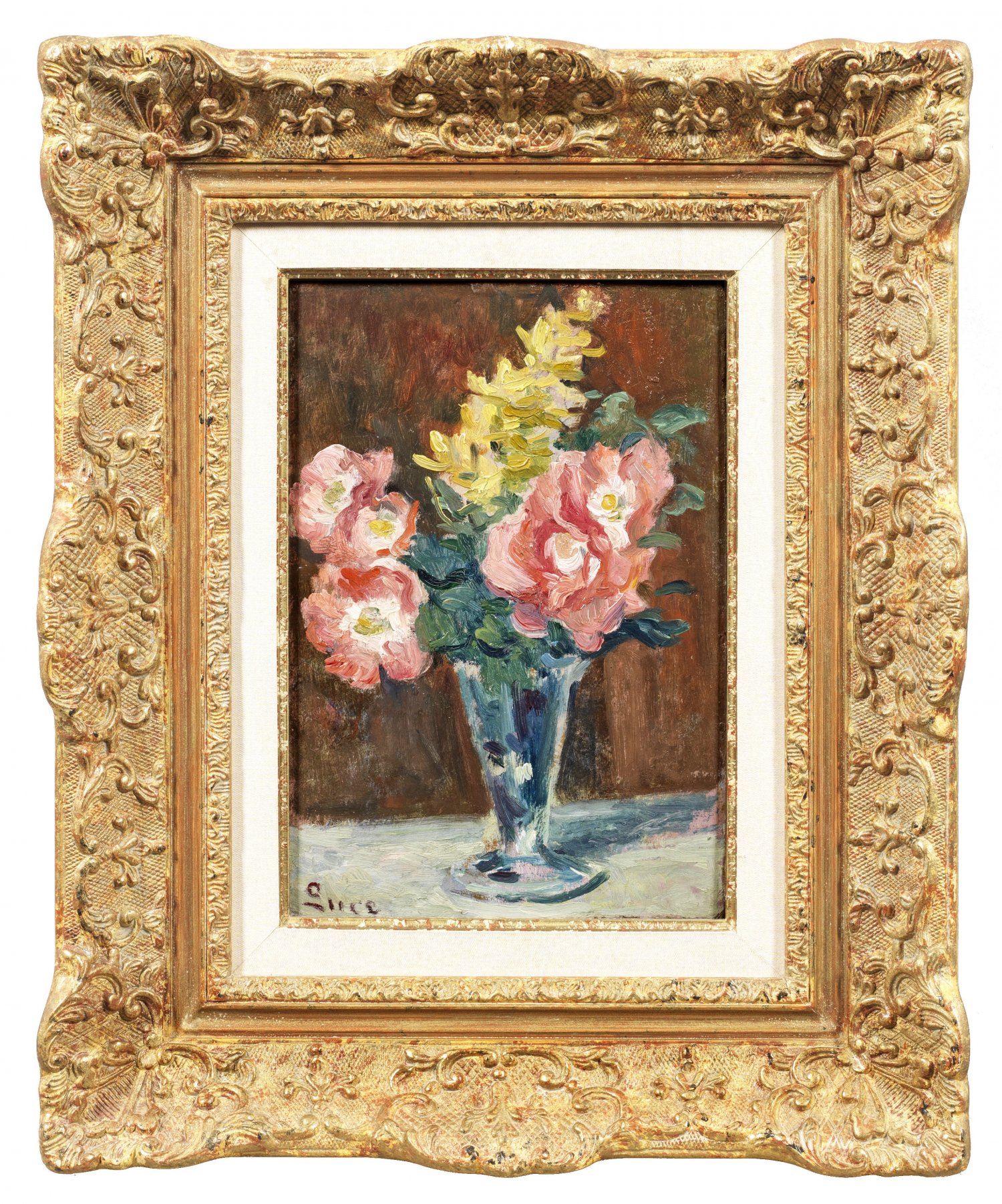 In einer Vase arrangierter, kleiner Strauß aus rosafarbenen und gelben Blumen. Luce, der sich im Laufe seines Künstlerlebens dem Neoimpressionismus, Pointillismus und Impressionismus zuwandte, gehörte zu den engen Freunden von Camille Pisarro und Georges Seurat. Regelmäßig zeigte er seine Werke 1887-1941 im "Salon des Indépendants"; 1889 und 1892 stellte er überdies mit der Künstlergruppe "Les XX" in Brüssel aus, wo er Théo van Rysselberghe kennenlernte. Öl/Malkarton. L. u. sign.; 29 cm x 19,5 cm. Rahmen.