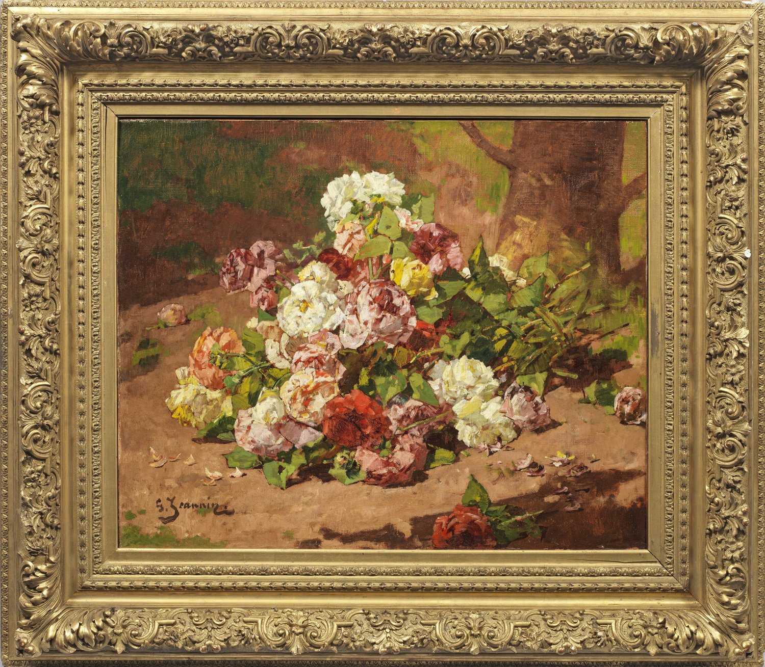 Darstellung eines flüchtig abgelegten Straußes mit verschiedenfarbigen Blüten. Mit virtuos lockerem, breitem Duktus gemaltes, impressionistisches Blumenstillleben in duftig frischem Kolorit. Charakteristisches Werk des Künstlers, der ein Schüler von Victor Vincelet war. Im Pariser Salon stellte er ab 1868 regelmäßig Blumen- und Früchtestillleben aus, insbesondere mit Rosenmotiven, für die er mehrfach ausgezeichnet und 1903 zum Ritter der Ehrenlegion ernannt wurde. Überdies beteiligte sich Jeannin an den Weltausstellungen von 1889 und 1900 in Paris. Werke Jeannins befinden sich in bedeutenden französischen Museen wie dem Musée d'Orsay. Öl/Lwd.; L. u. sign.. 65 cm x 81 cm. Wohl Original-Rahmen.