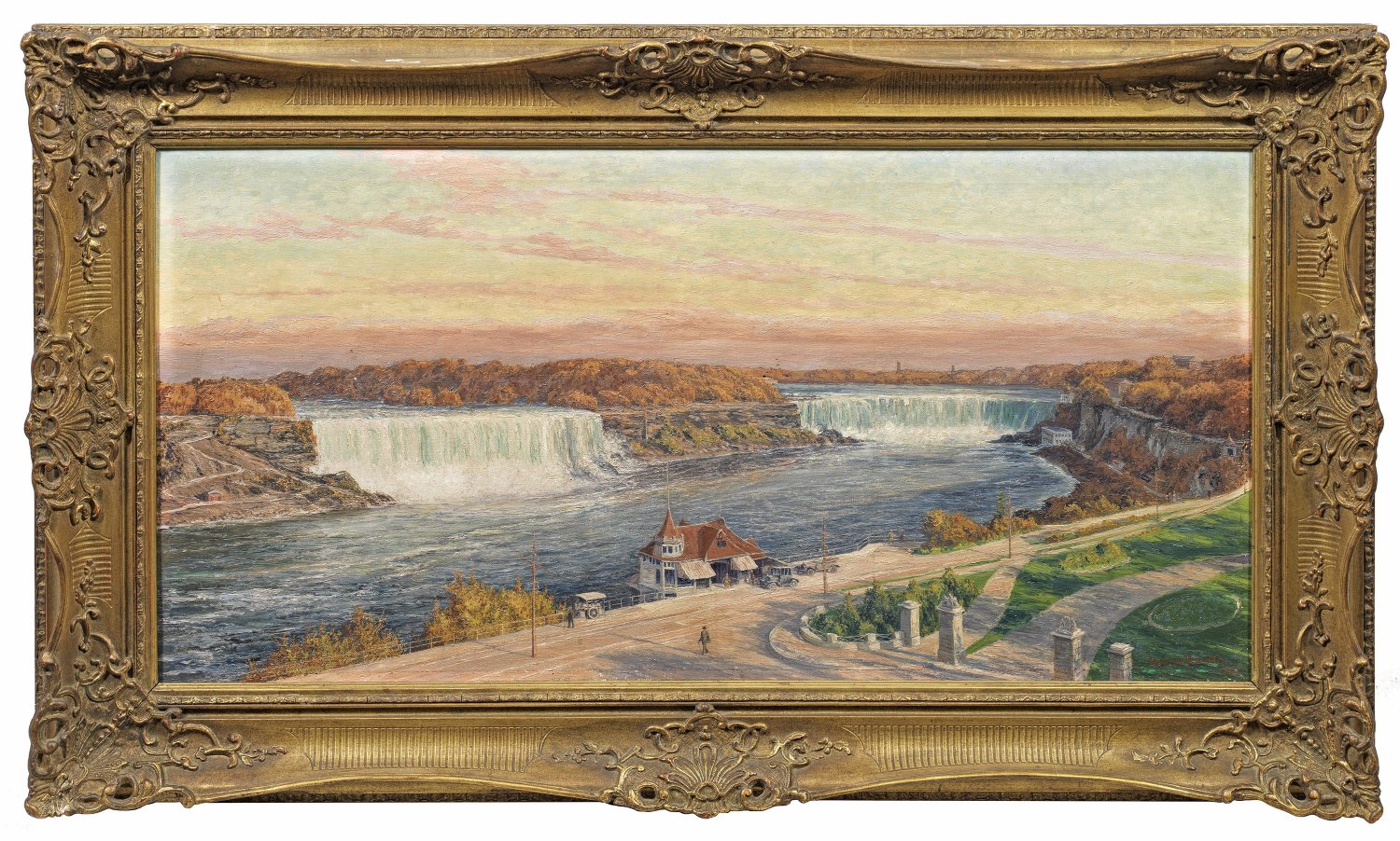 Im breiten Panoramaformat komponierter Blick von der kanadischen Seite auf die Wasserfälle, im Vordergrund die Zufahrt des Victoria-Parks mit Aussichtsgebäude, Automobilen und Staffagefiguren. Koloristisch subtil eingefangene Impression der Landschaft im weichen Abendlicht, der Himmel in nuanciert changierenden Rot-, Gelb- und Blautönen. Richard de Bruycker stammte aus einer verzweigten Malerfamilie und unternahm 1924 eine Reise nach Nordamerika, die ihn - wie das vorliegende Gemälde zeigt - wahrscheinlich auch an die Niagarafälle führte. Öl/Lwd.; R. u. sign. u. dat. 1928. Verso vom Künstler nochmals sign., betitelt, bez. u. dat. "B. 214 'Niagarafälle i. der Abendstimmung' Rich. de Bruycker 1928". 50 cm x 100 cm.