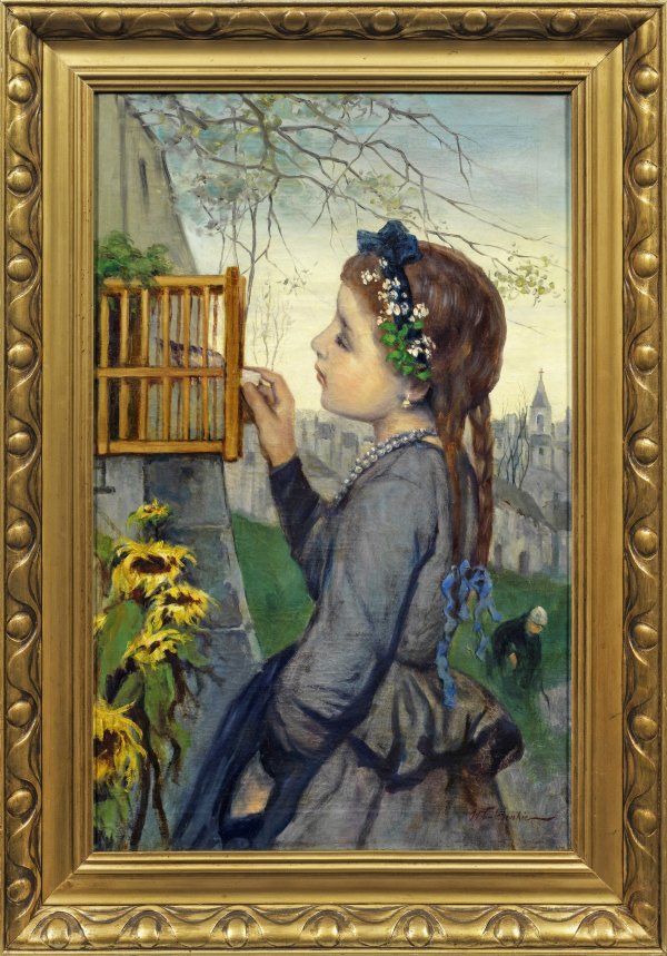 Stimmungsvolles, realistisch gemaltes Bildnis des vornehm gewandeten Mädchens mit Perlenkette, blumen- und schleifengeschmückten Haar, das im Profil geschildert vor dem Käfig steht und den Vogel füttert; im Hintergrund eine alte Stadt. Wankie lernte 1875-1881 in der Zeichenklasse von Wojciech Gerson in Warschau sowie bei Wladyslaw Luszczkiewicz und Jan Matejko an der Kunstgewerbeschule in Krakau. Da er die dort dominierende akademische Kunst nicht akzeptierte, ging er 1882 nach München, wo er zwanzig Jahre lebte. Dort gehörte er zu einer Reihe polnischer Künstler, die zu dem Kreis von Józef Brandt gehörten. Er traf andere Maler wie Jan Rosen, Wladyslaw Szerner, Tadeusz Ajdukiewicz, Wladyslaw Czachórski, Jan Chelminski, Alfred Schouppé, Apoloniusz Kedzierski und Józef Kania. Um 1888 lernte er in München zudem Aleksander Gierymski kennen, der ihn dazu anregte, sich verstärkt mit Freilicht-Studien zu beschäftigen und eine Sensibilität für die in der Natur beobachteten Farb- und Lichteffekte zu entwickeln. Erst 1903 kehrte er nach Polen zurück und wurde in Warschau ansässig. Das Oeuvre Wankies umfasst vornehmlich Landschaften, Genreszenen sowie religöse und allegorisch-symbolistische Motive. Öl/Lwd.; R. u. sign.; 77 cm x 50,5 cm. Rahmen.