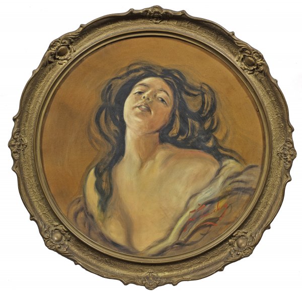 Brustbildnis, den Kopf mit langem, braunem Haar lasziv nach hinten gestreckt, die Schultern nur teilw. von einem heruntergeschobenen Mantel bzw. Umhang bedeckt. Mit dynamischem, schwungvollem Duktus gemaltes, für Zmurko charakteristisches, sinnliches Jugendstil-Bild in warmen Goldtönen. Der bedeutende polnische Künstler lernte zunächst bei dem Lemberger Maler Franciszek Tepa, ab 1876 studierte er an der Krakauer Akademie bei Jan Matejko und wechselte 1877 an die Kunstakademie in München zu Alexander von Wagner. 1880 übersiedelte Zmurko nach Krakau; durch ein Stipendium Kaiser Franz Joseph I. bildete er sich in Rom weiter. 1882 ging Zmurko nach Warschau, wo er bis zu seinem Lebensende lebte. Zmurko stellte ab 1880 vielfach in Warschau und Krakau aus und beschickte überdies internationale Ausstellungen in Paris, London, Chicago und San Francisco. Hierdurch wurde er nicht nur in Polen geschätzt, ganz Europa bewunderte seine Gemälde, sogar aus Amerika erhielt er Aufträge. Sein Hauptsujet waren in Öl und Pastell gemalte schöne Frauen, Bildnisse und erotische Halbakte, auch Haremsszenen und Szenen aus der Mythologie. Hierbei wurde er von den aktuellen Kunstströmungen des Symbolismus, Impressionismus und Jugendstil beeinflusst. Öl/Malkarton. R. u. sign.; D. 69,5 cm. Rahmen.