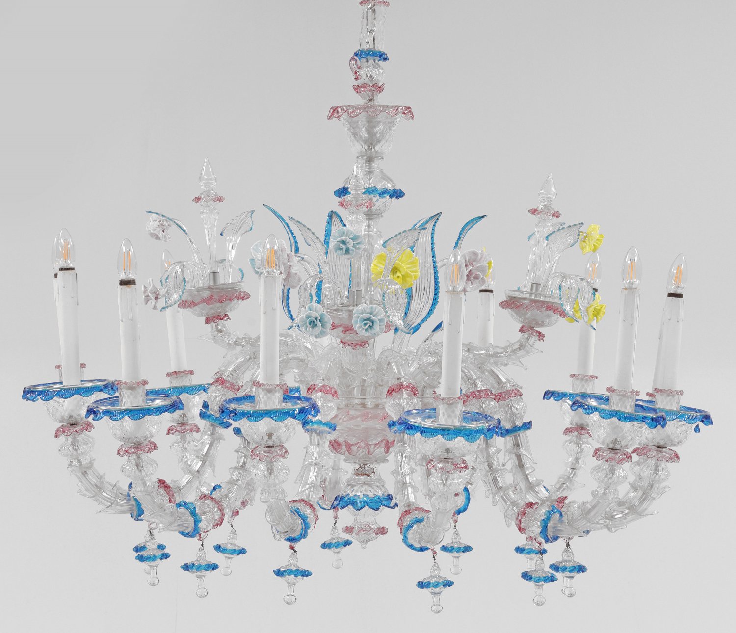 Großer Murano-Deckenleuchter 12-flg.; Farbloses sowie blaues, roséfarbenes und gelbes Glas. Mehrfach gegliederter Balusterschaft mit Zapfenanhänger. In der Mitte großes Schalenelement, davon ausgehend stark geschwungene Leuchterarme mit großen, tief gemuldeten Traufschalen, langen, zylinderförmigen Tüllen und Balusteranhängern. Dekorationen aus großen, gestreckten Blättern und Rosenblüten. Lange Kettenaufhängung. Elektrifiziert. Fehlstellen. Leuchter-H. 110 cm. D. 120 cm.