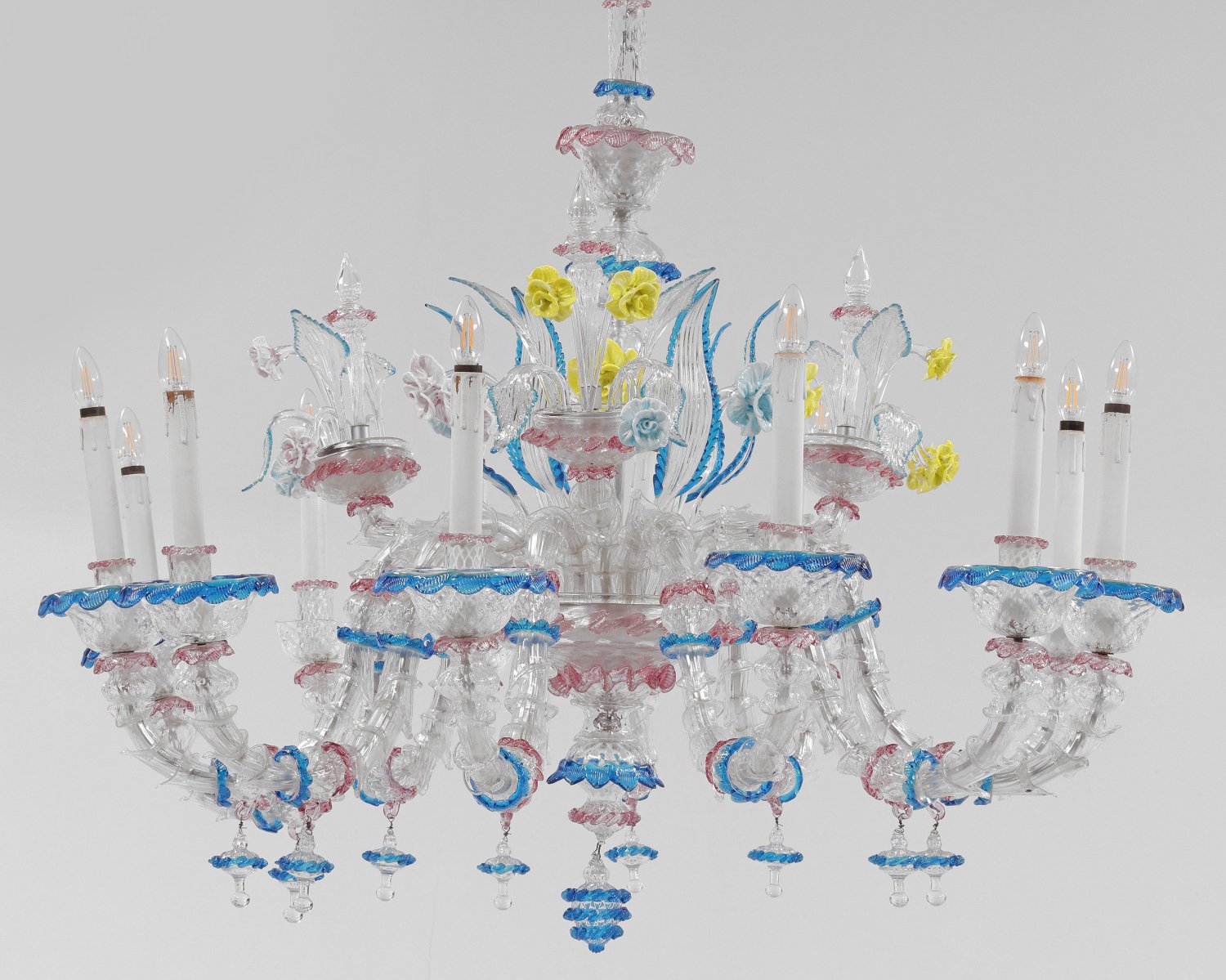 Großer Murano-Deckenleuchter 12-flg.; Farbloses sowie blaues, roséfarbenes und gelbes Glas. Mehrfach gegliederter Balusterschaft mit Zapfenanhänger. In der Mitte großes Schalenelement, davon ausgehend stark geschwungene Leuchterarme mit großen, tief gemuldeten Traufschalen, langen, zylinderförmigen Tüllen und Balusteranhängern. Dekorationen aus großen, gestreckten Blättern und Rosenblüten. Lange Kettenaufhängung. Elektrifiziert. Fehlstellen. Leuchter-H. 110 cm. D. 120 cm.