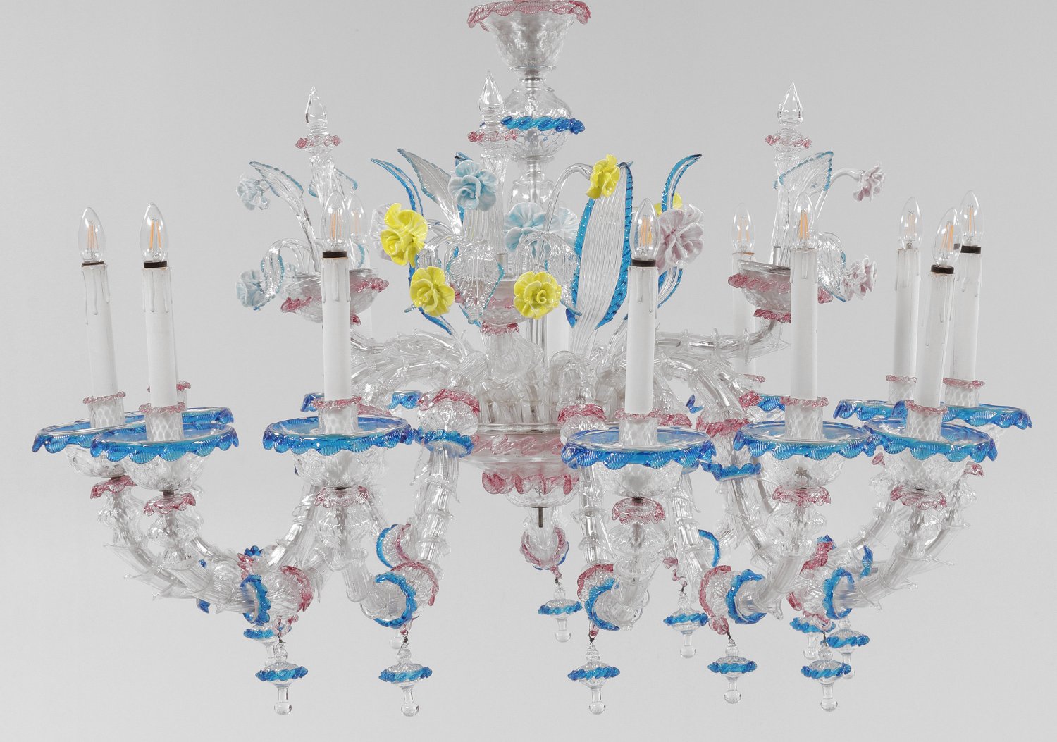 Großer Murano-Deckenleuchter 12-flg.; Farbloses sowie blaues, roséfarbenes und gelbes Glas. Mehrfach gegliederter Balusterschaft mit Zapfenanhänger. In der Mitte großes Schalenelement, davon ausgehend stark geschwungene Leuchterarme mit großen, tief gemuldeten Traufschalen, langen, zylinderförmigen Tüllen und Balusteranhängern. Dekorationen aus großen, gestreckten Blättern und Rosenblüten. Lange Kettenaufhängung. Elektrifiziert. Fehlstellen; Leuchter-H. 85 cm. D. 120 cm.