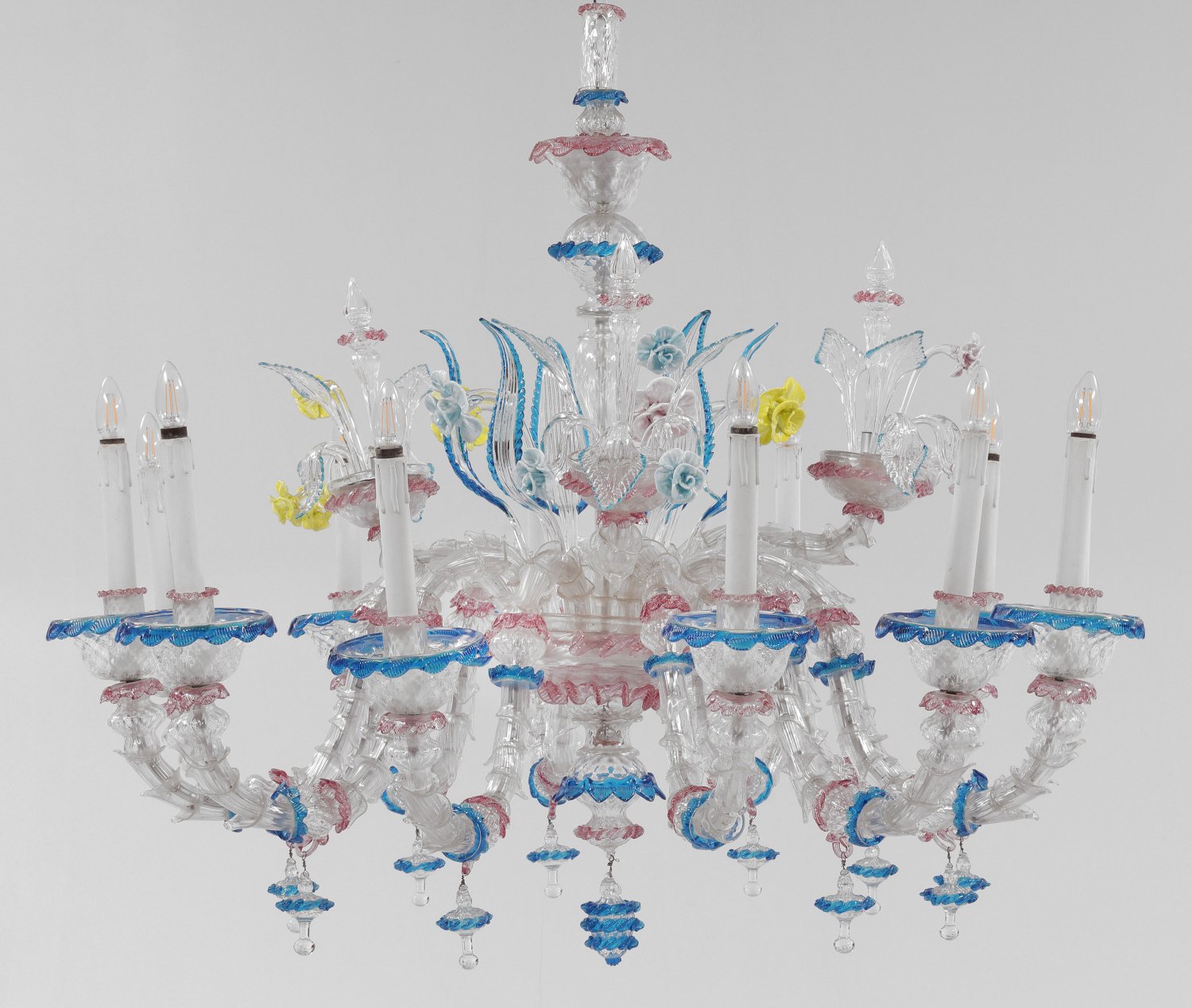 Großer Murano-Deckenleuchter 12-flg.; Farbloses sowie blaues, roséfarbenes und gelbes Glas. Mehrfach gegliederter Balusterschaft mit Zapfenanhänger. In der Mitte großes Schalenelement, davon ausgehend stark geschwungene Leuchterarme mit großen, tief gemuldeten Traufschalen, langen, zylinderförmigen Tüllen und Balusteranhängern. Dekorationen aus großen, gestreckten Blättern und Rosenblüten. Lange Kettenaufhängung. Elektrifiziert. Teilw. besch.; Leuchter-H. 110 cm. D. 120 cm.