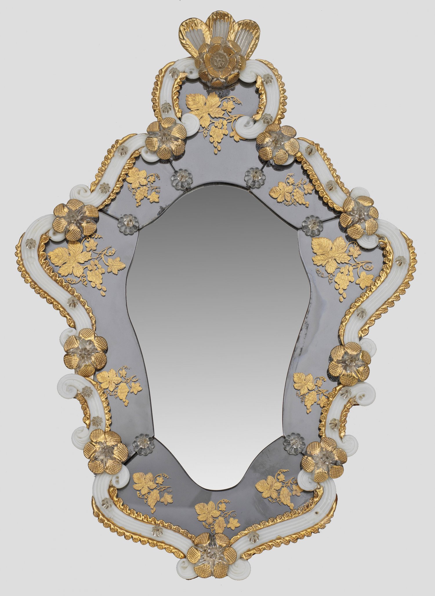 Kleiner Murano-Wandspiegel Weißes und farbloses Glas, teilw. vergoldet sowie teilw. rauchfarbenes Spiegelglas. Passig geschweifte Spiegelrahmung aus gegeneinander gestellten Voluten und applizierten Blütenmotiven. Dekor aus flach reliefierten Weinreben. Rückseitig Etikett "Galeria Calabrese Catania". 52 cm x 36,5 cm.