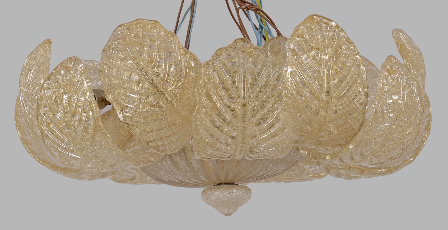 Plafoniere "Rex" von Barovier & Toso Farbloses Muranoglas mit goldfarbenen Einschmelzungen. Korpus aus großen, stark gebogten, blütenartig angeordneten Blättern. Unbez. Sieben Lampenfassungen. Elektrifiziert. H. 18 cm. D. 45 cm.
