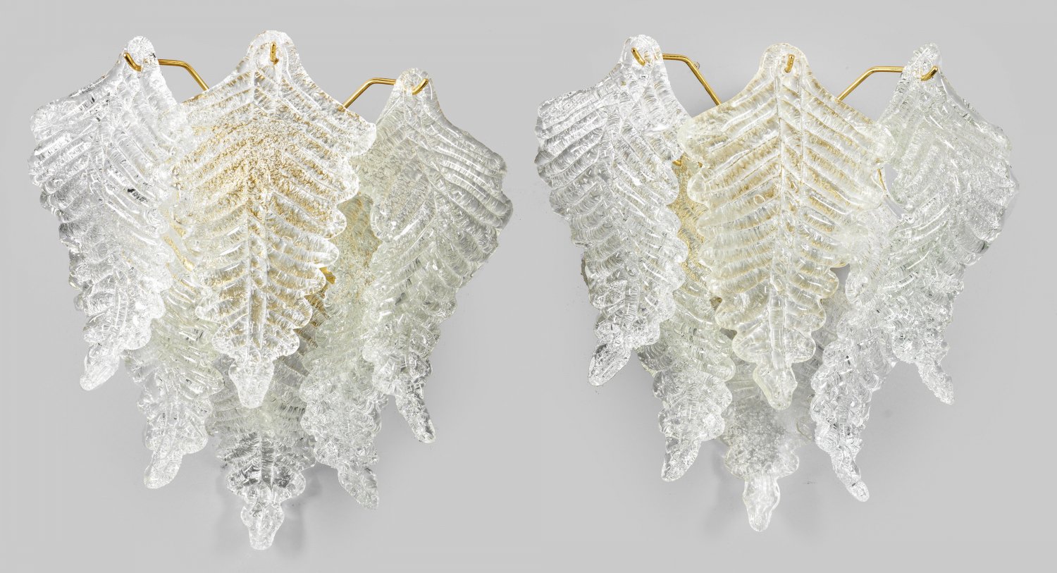 Satz von elf Wandappliken Farbloses Muranoglas und vergoldetes Metall. Rundes Wandschild mit gebogten Streben als Träger für freischwingende große Farnblätter. Innen zwei Lampenfassungen. Elektrifiziert. 39 cm x 30 cm.
