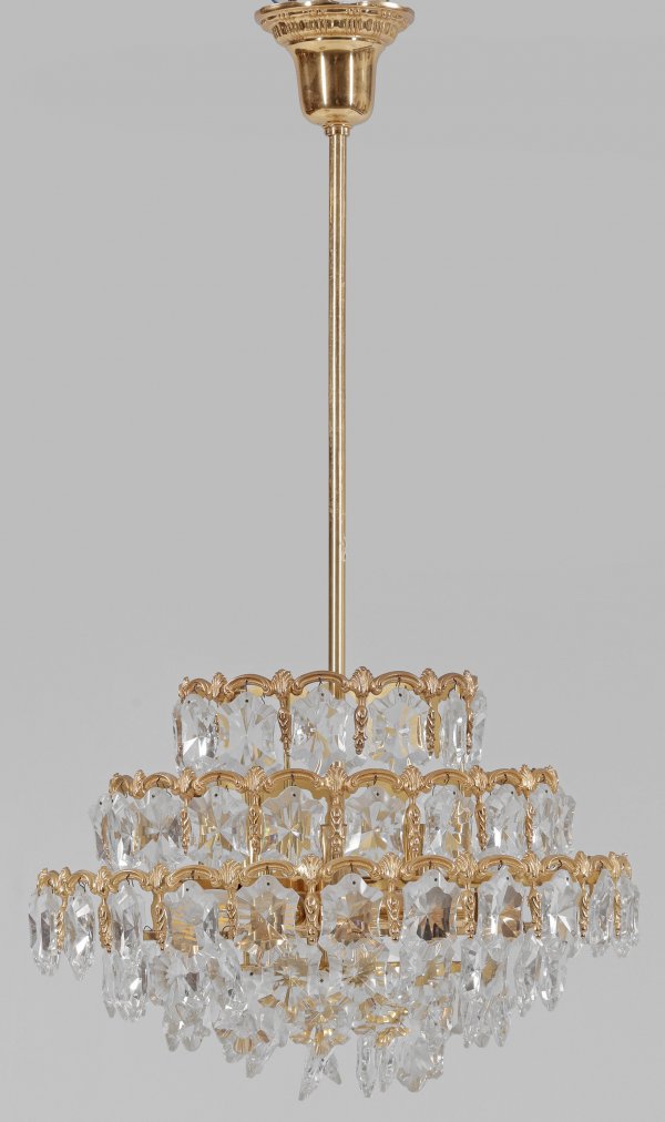 Vintage-Kronleuchter Metall vergoldet sowie farbloses Glas. Gestaffelt angeordneter Korpus aus dekorativ ornamentierten Stegen mit reichem Behang aus facettierten Prismen. Oberhalb schlanker Schaft. Zehn Lampenfassungen. Elektrifiziert. H. 80 cm. D. 43 cm.