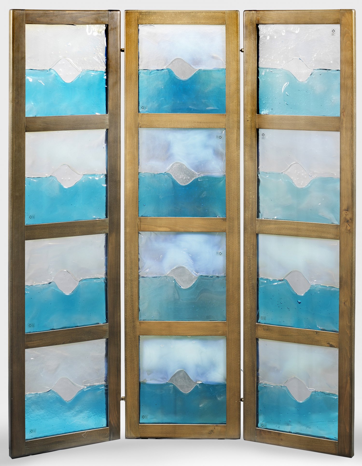 Murano-Paravent 3-tlg.; Buchenholz, dunkel gebeizt sowie farbloses, teilw. opakes und blaues, organisch verschmolzenes Glas. Hochrechteckige Paneele aus geraden Streben und Stegen als Träger für je drei quadratische Glaseinsätze. Herstelleretikett. Pro Paneel 170 cm x 46,5 cm.