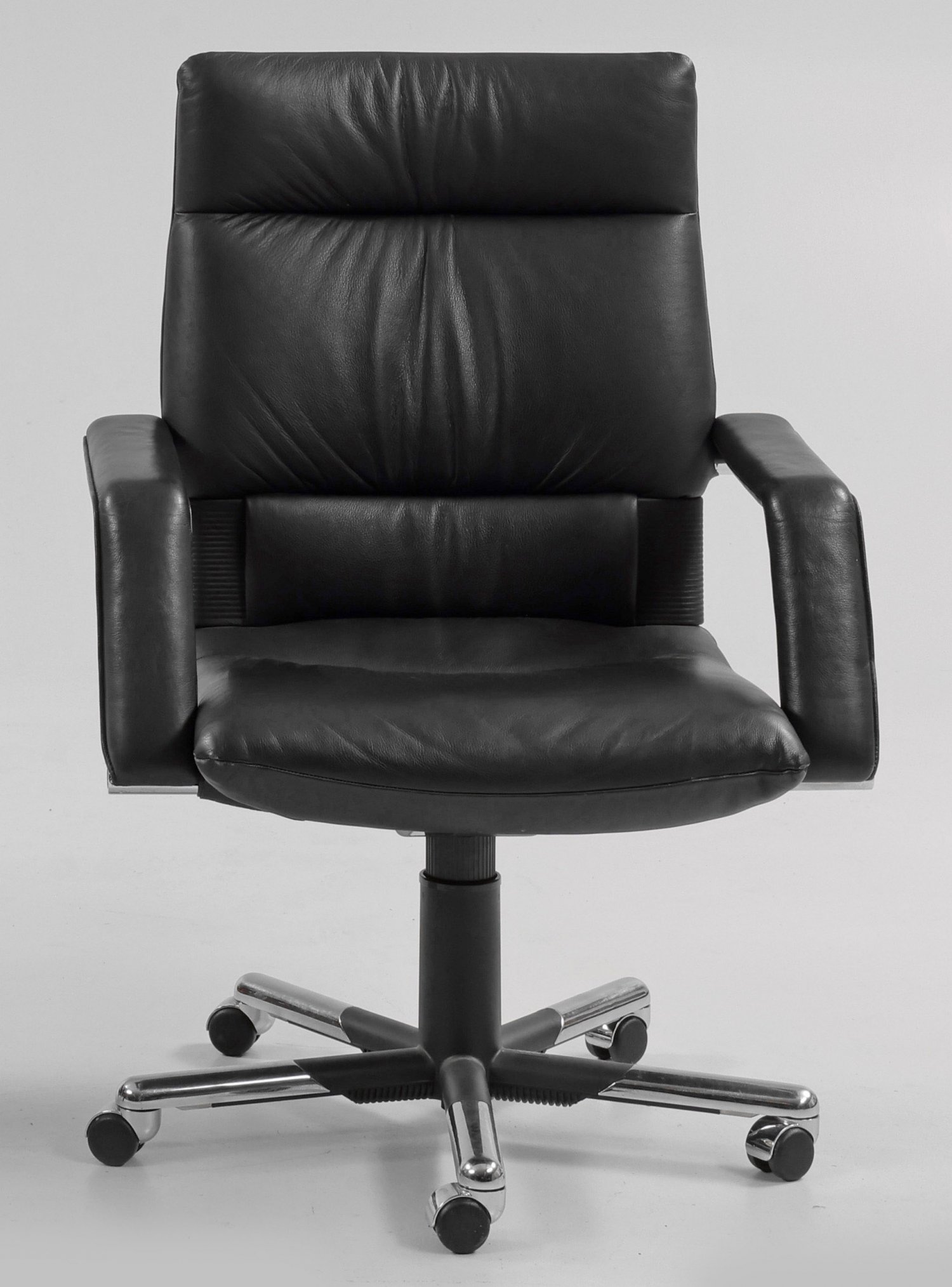Schreibtischsessel "Imago" von Mario Bellini Metall, verchromt sowie schwarzes Leder. Über sternförmigem Fuß mit Rollen und zylinderförmigem Schaft höhenverstellbare Sitzfläche mit breiten Armlehnen. Rechteckige, zurückschwenkbare Rückenlehne. Herstellerzeichen sowie geritzte Künstlersignatur. Entw. Mario Bellini, 1984. Sitz-H. 45-53 cm.