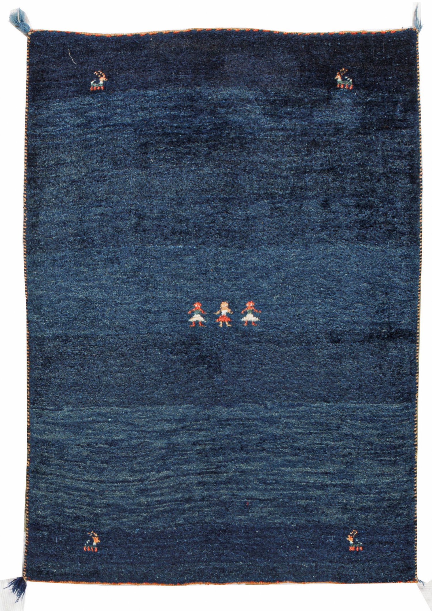 Kleine Gabbeh-Brücke Wolle auf Wolle. Auf blauem abraschiertem Fond kleine lose gestreute Figurenmotive. 102 cm x 146 cm.