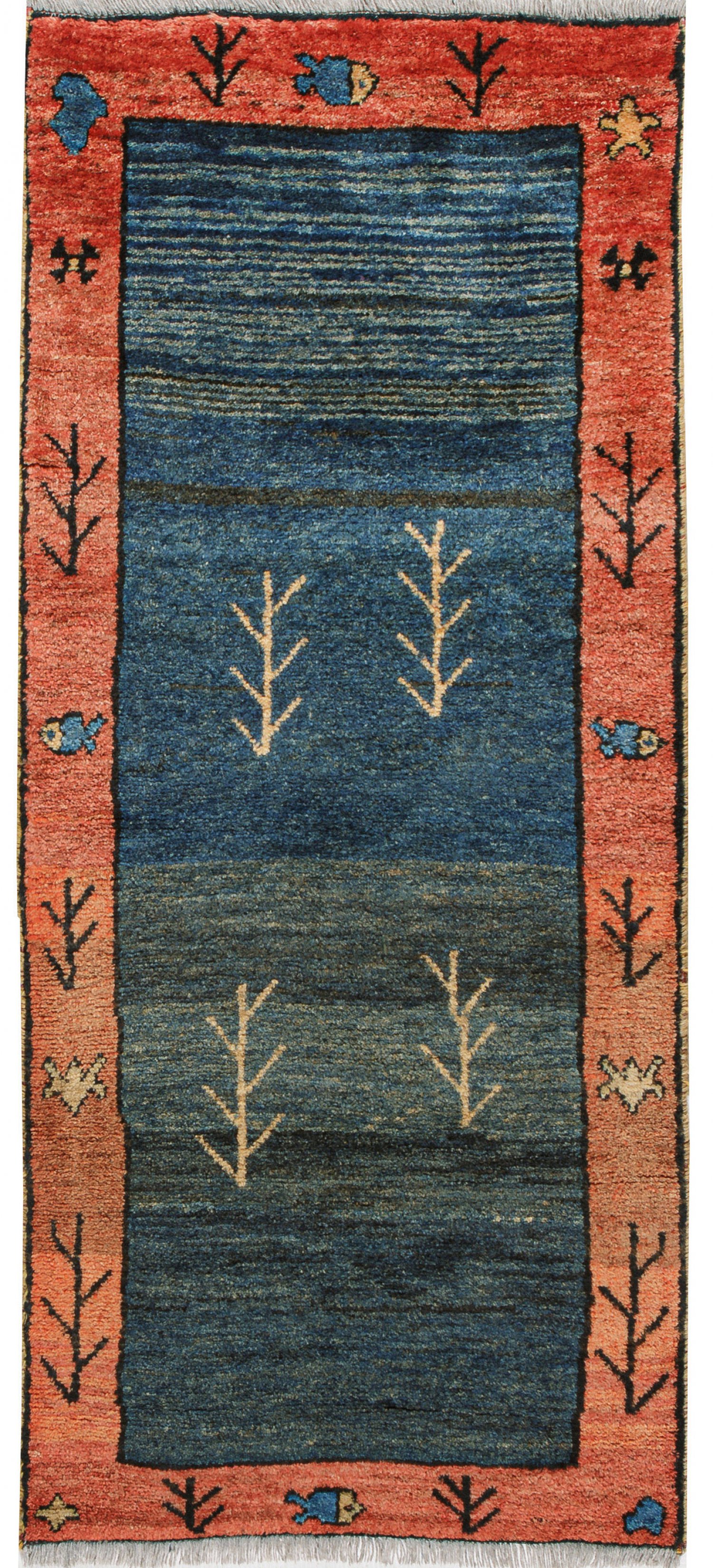 Kleiner Gabbeh-Läufer Wolle auf Wolle. Im blauen abraschierten Innenfeld vier Zweige sowie umlaufend breite orangefarbene Bordüre mit entsprechendem Dekor. 88 cm x 197 cm.