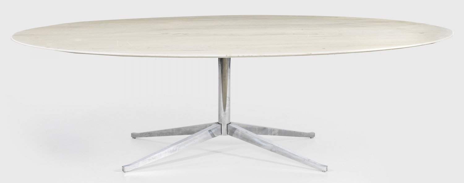 Metall, verchromt bzw. schwarz lackiert und weißer, hellgrau gemaserter Marmor. Über schmalen Streben schlanker Rundschaft als Träger für ovale, besch. und teilw. rest. Deckplatte. Unbez. Entw. Florence Knoll, 1961. H. 70 cm. 245 cm x 134 cm.