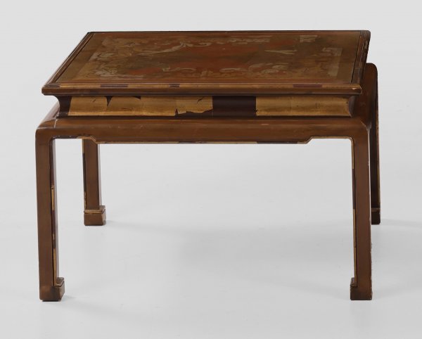 Beistelltisch im asiatischen Stil Holz in unterschiedlichen Brauntönen lackiert und teilw. vergoldet. Gerundete Zarge auf gekanteten Beinen als Träger für rechteckige profilierte Deckplatte mit üppigem Dekor aus Blattvoluten. Bez. Dieken München St. Paul France. H. 43 cm. 67 cm x 56 cm.