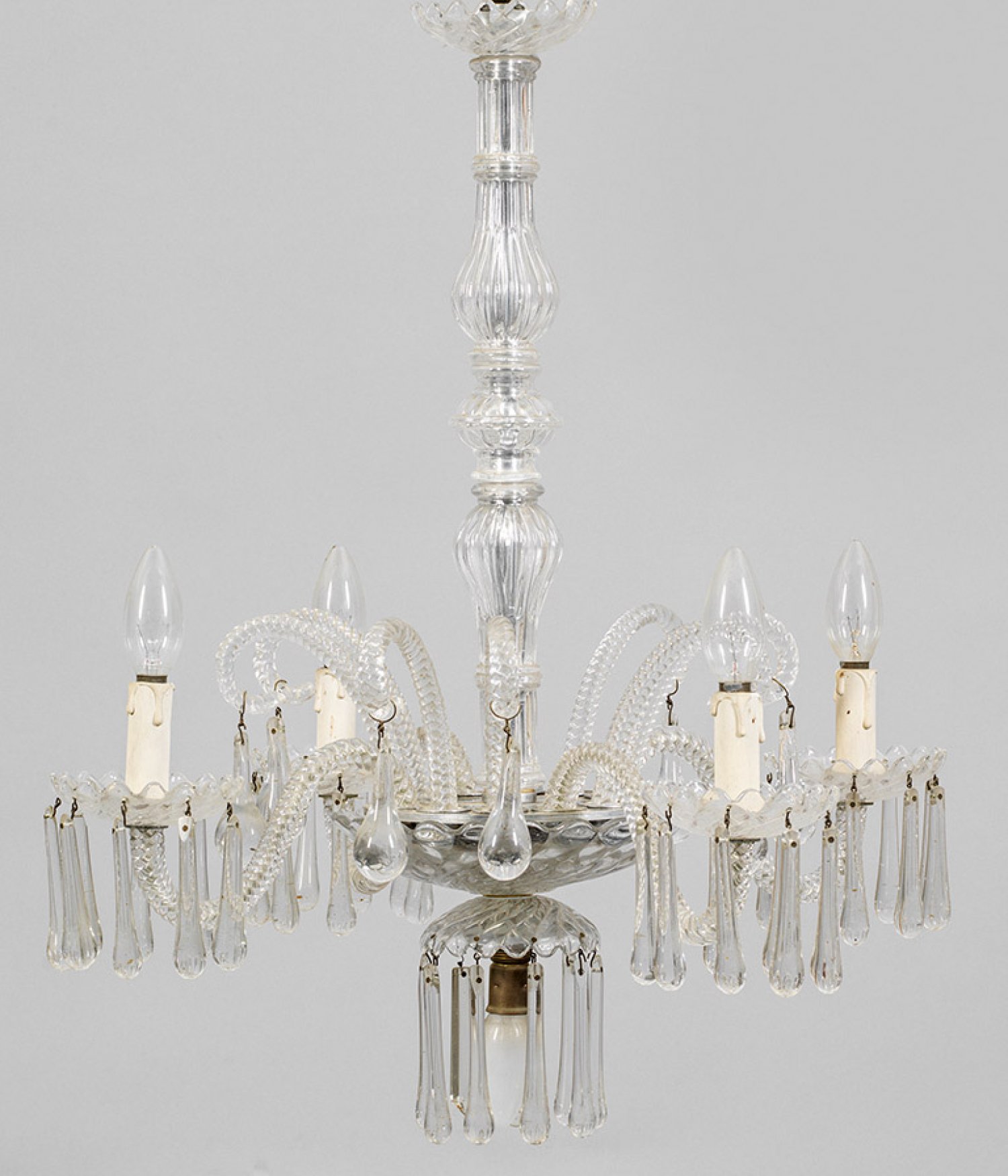 Kleiner Murano-Deckenlüster 5-flg.; Farbloses Glas. Mehrfach gegliederter Balusterschaft sowie flaches Rosettenelement als Träger für vier stark geschwungene Leuchterarme mit korrespondierenden Traufschalen und zylinderförmigen Tüllen. Entsprechende Streben mit Tropfenbehang. Kettenaufhängung. Elektrifiziert. Lampen-H. 67 cm. D. 54 cm.