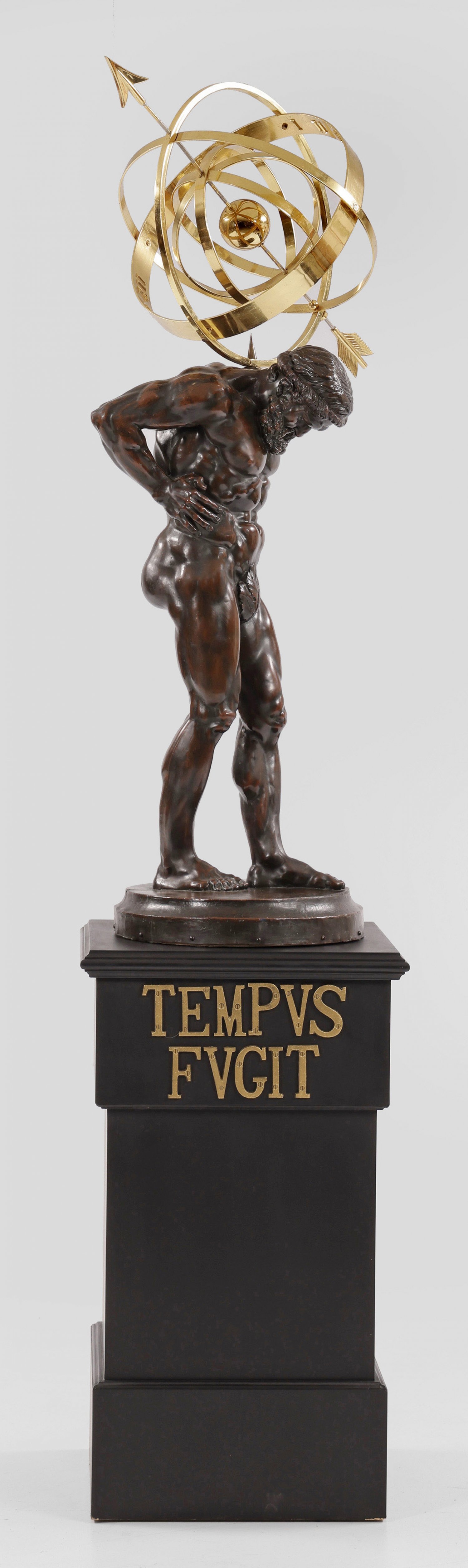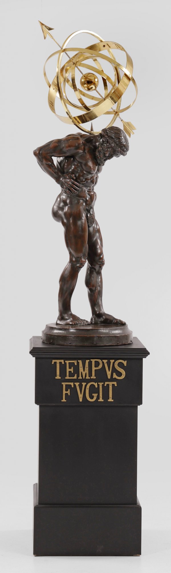 Große skulpturale Sonnenuhr Messing, Kupferblech, dunkel patiniert sowie Holz, schwarz lackiert. Vollplastische Darstellung einer Atlantenfigur als Träger für Sonnenuhr mit erhabenen römischen Zahlen. Unterhalb hoher Podestsockel mit appliziertem Sinnspruch "TEMPVS FVGIT". Ges.-H. 216 cm.