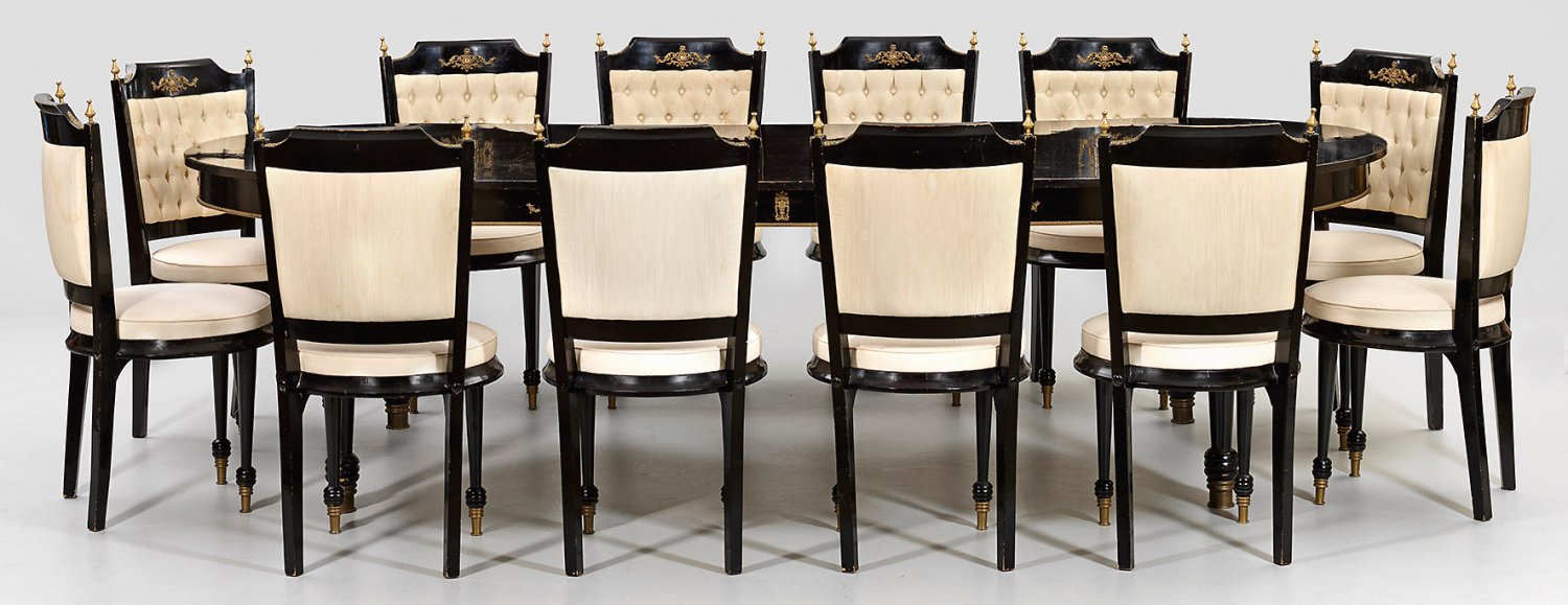 Große Napoleon III-Tischgruppe 13-tlg.; Ebonisiertes Holz. Bombierte Zarge auf Balusterbeinen. Gering überstehende Deckplatte. Korrespondierende Stühle mit runden Sitzflächen sowie rechteckiger Rückenlehnenrahmung mit Balusterbekrönungen. Gepolstert und mit cremefarbenem Stoff bezogen. Profile und Applikationen aus Bronze. Tisch-H. 82,5 cm. 300 cm x 120 cm. Sitz-H. 50 cm.