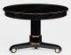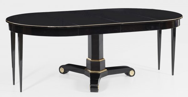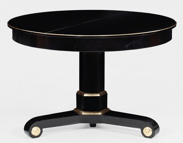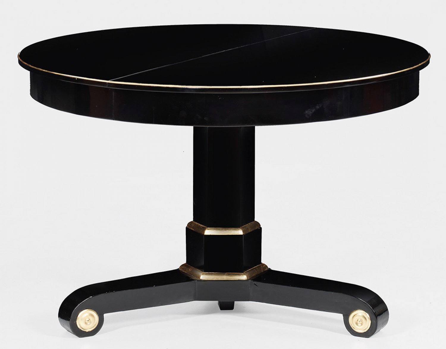 Ausziehtisch im Empire-Stil Flächendeckender Fond aus Schwarzlack sowie teilw. Akzentuierungen in Gold. Über flachen volutenähnlichen Streben mehrfach gekanteter Schaft als Träger für bombierte Zarge und gering überstehende Deckplatte. Dazu zwei Einsteckplatten. H. 78 cm. 120 cm x 120/220 cm.