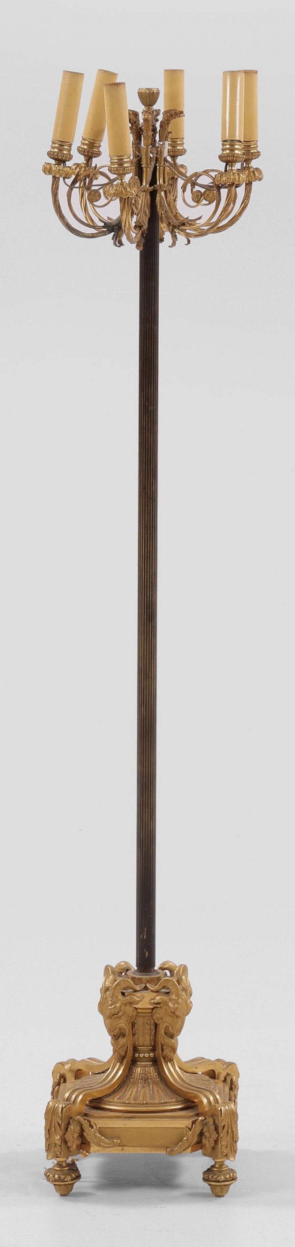Louis XVI-Salonlampe 6-flg.; Bronze, vergoldet. Über geschweift ansteigendem Sockel, flankiert von Blattvoluten, schlanker godronierter Schaft als Träger für Leuchtmittel in Form von stark geschwungenen Leuchterarmen aus eingerollten Voluten mit zylinderförmigen Tüllen. Elektrifiziert. H. 144 cm.