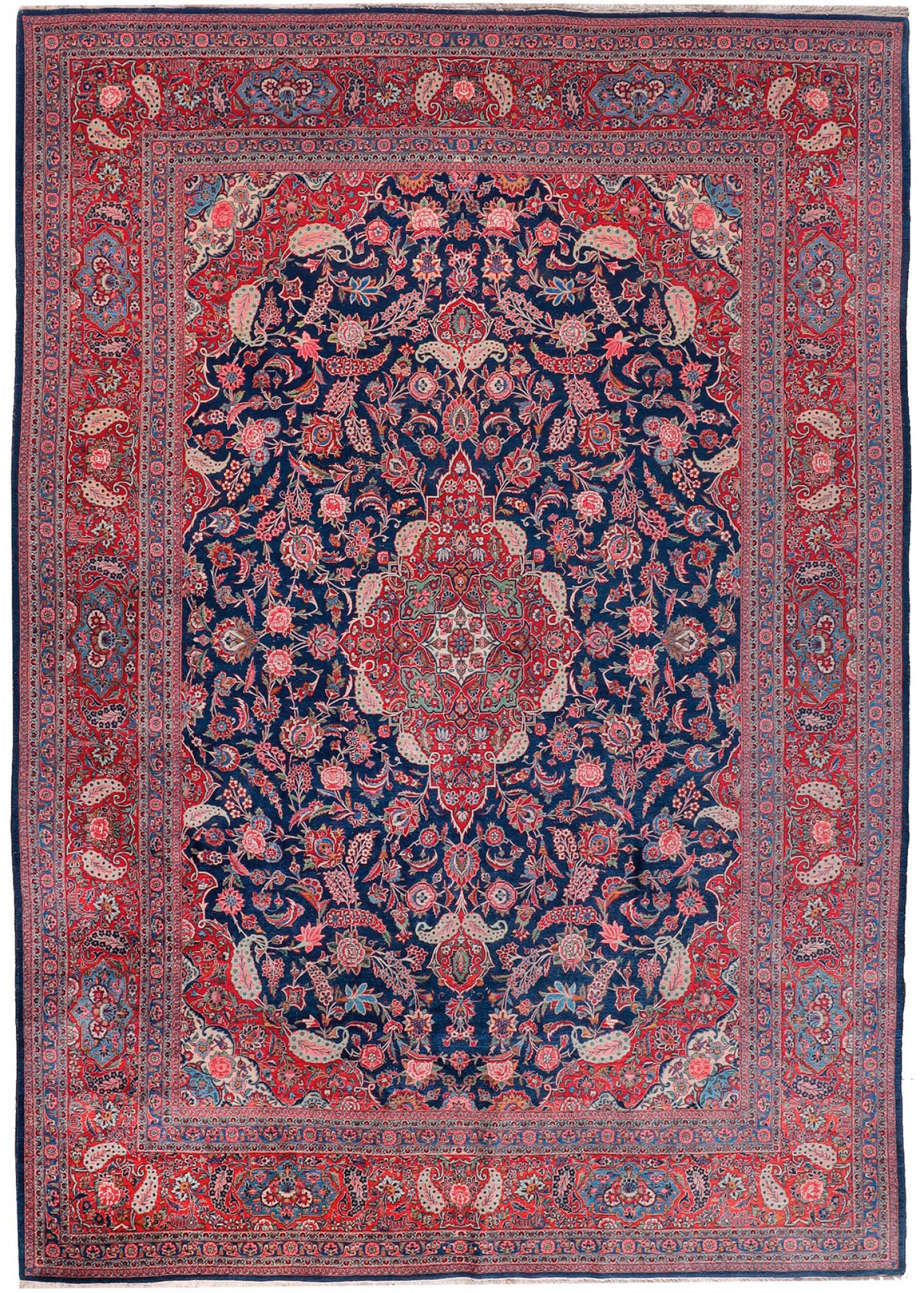 Großer alter Keschan-Teppich Persien. Mitte 20. Jh.; Korkwolle auf Baumwolle. Im royalblauen Innenfeld großes, gestrecktes Medaillon sowie breite, passig geschweifte Ecklösungen. Flächendeckende Musterung aus üppigen Palmettenranken und Blütenrispen. Umlaufend breite, rotgrundige Hauptbordüre mit hellblauen Kartuschen, flankiert von schmalen Nebenbordüren. 380 cm x 260 cm.