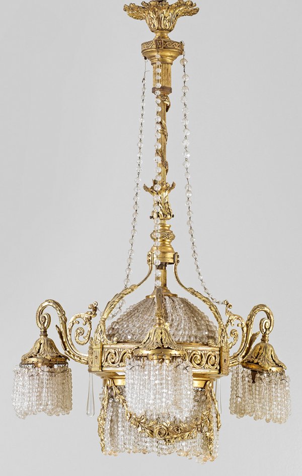 Belle Epoque-Deckenlampe 3-flg.; Messing, vergoldet sowie farbloses Glas. Breiter, durchbrochen gearbeiteter Reif aus eingerollten Blattvoluten mit kuppelförmigem Abschluss als Träger für Leuchtmittel aus vier Lampenfassungen. Davon ausgehend drei hoch aufgeworfene Leuchterarme mit kelchförmigen Lampenfassungen. Oberhalb geschwungene Streben sowie mehrfach gegliederter Balusterschaft. Üppiger Behang aus Prismenkugeln. Elektrifiziert. Altersspuren und Fehlstellen. H. 83 cm. D. 45 cm.