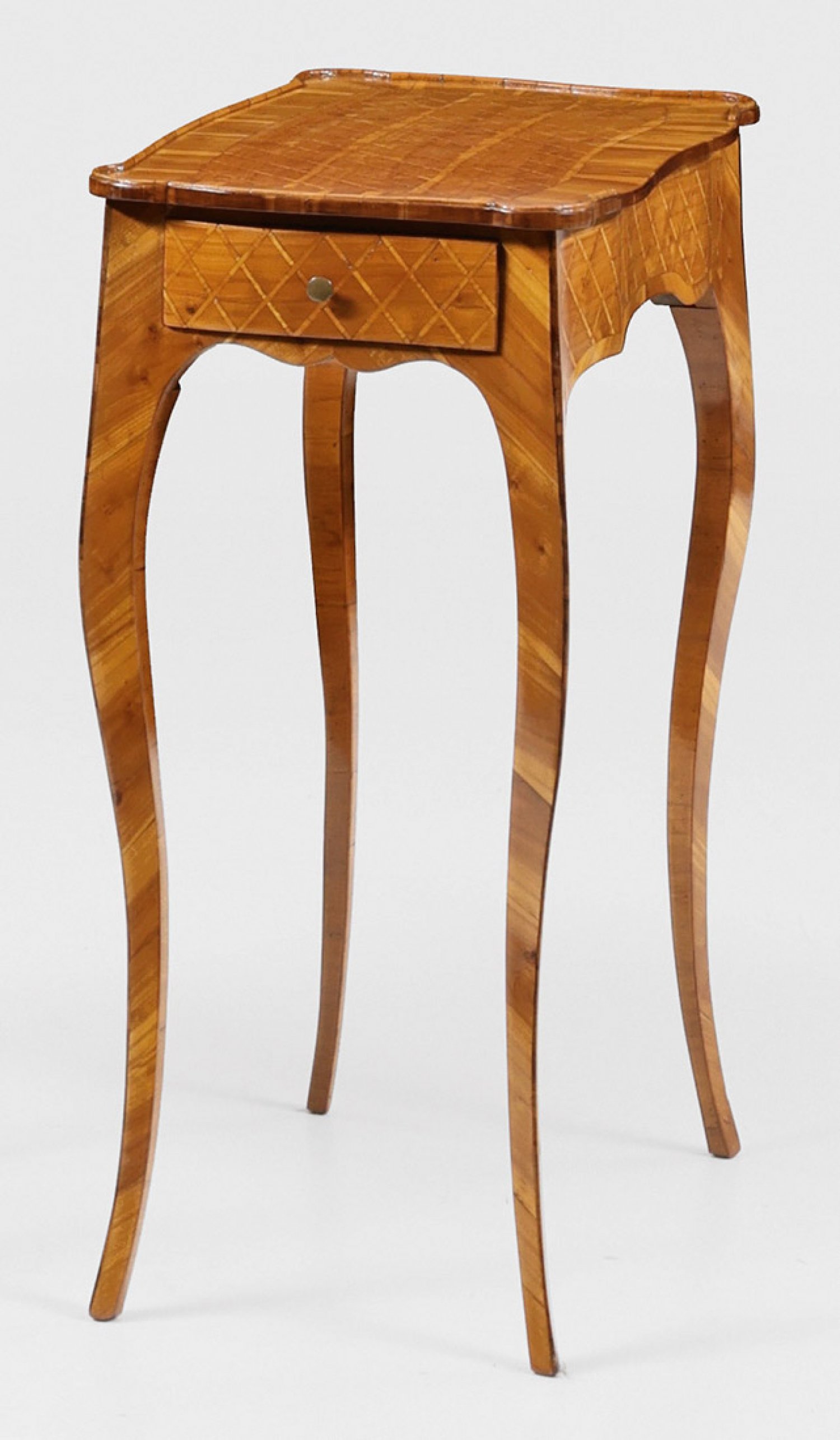 Kleiner Louis XV-Beistelltisch Kirschbaum, furniert. Bombierter, einschübiger Zargenkasten, flankiert von schmalen Ecklisenen, in hohe, geschwungene und spitz zulaufende Beine übergehend. Gering überstehende Deckplatte mit flacher Galerierahmung. Allseitig breit gerahmte Furnierfelder mit Gitterwerk. Rest. mit Erg.; H. 71 cm. 52,5 cm x 33 cm.