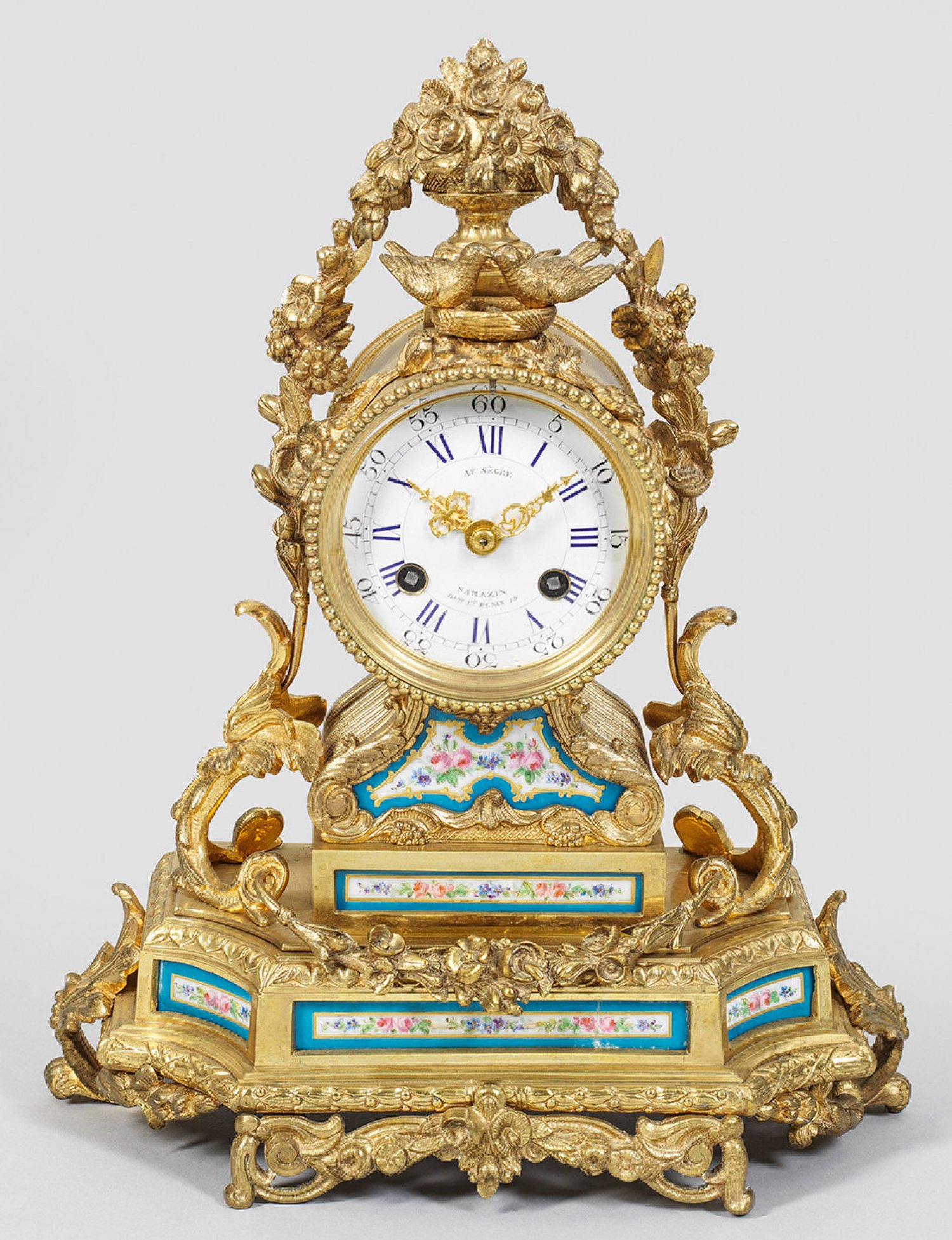 Napoleon III-Pendule Bronze, vergoldet sowie polychrom gestaltete Porzellanplaketten. Balusterförmiger Korpus, flankiert von Rocaillespangen auf profilgerahmtem Podestsockel und Volutenfüßen. Schauseitig eingelassene Plaketten mit Blütendekor, teilw. besch.; Vasenförmiger oberer Abschluss sowie Bekrönung in Form eines schnäbelnden Taubenpaares mit Nest. Verglastes Emailzifferblatt, bez. Sarazin aus Nčgre. Pendulenwerk mit Pendelfeder sowie Halbstundenschlag auf Glocke. H. 34,5 cm. 27 cm x 13 cm.
