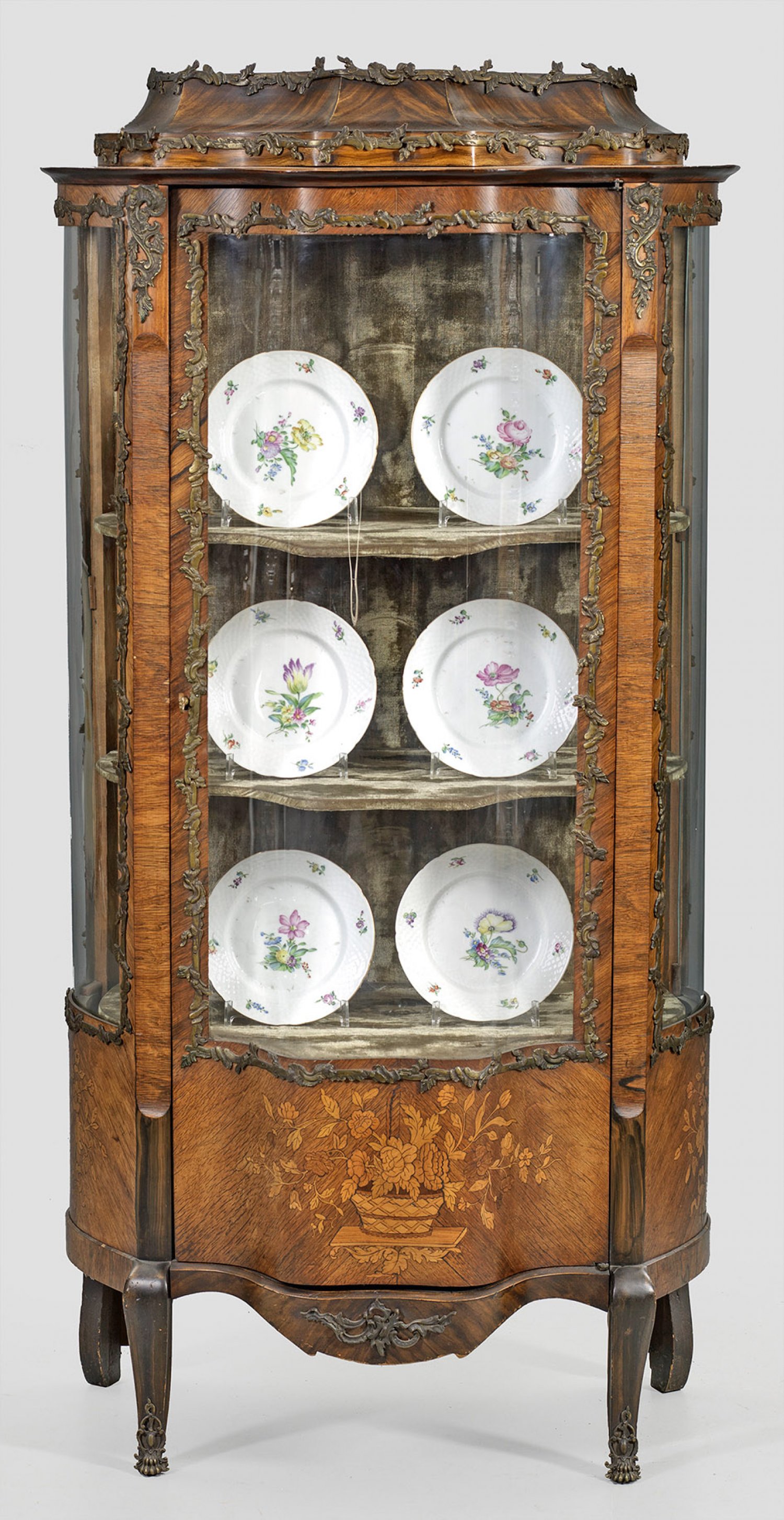 Louis XV-Salonvitrine Palisander furniert sowie Einlagen aus unterschiedlichen Edelhölzern. Bombierter dreiseitig verglaster eintüriger Korpus mit gestuft ansteigendem oberen Abschluss flankiert von flachen Ecklisenen auf geschweiften Beinen. Gespiegelt angeordnete Furnierfelder mit reicher Marketerie aus intarsierten Blumenkörben. Reiche Floralapplikationen aus Bronze. H. 165 5 cm. 80 cm x 43 cm.