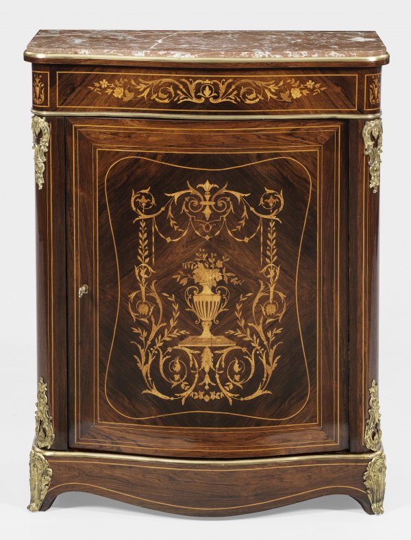 Napoleon III-Anrichte Palisander furniert sowie Einlagen aus unterschiedlichen Edelhölzern. Rechteckiger Korpus flankiert von gerundeten Lisenen auf passig geschweiftem Zargensockel. In der gegliederten Front bombierte Tür mit großem intarsiertem Vasenmotiv von üppigen Voluten umgeben. Applikationen und Profile aus Messing sowie eingelassene Deckplatte aus rotgemasertem Marmor. H. 104 cm. 81 cm x 41 cm.