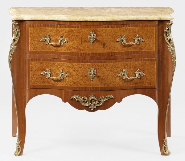 Louis XV-Kommode Mahagoni und Thujamaser furniert. Dreiseitig bombierter Korpus flankiert von schlanken weit ausgezogenen Ecklisenen in hohe leicht ausgestellte Beine übergehend. In der gegliederten Front zwei breite Schubladen mit gerahmten Furnierfeldern. Applikationen aus Bronze. Gering überstehende profilierte Deckplatte aus cremefarben gemasertem Marmor. H. 89 cm. 114 cm x 53 5 cm.